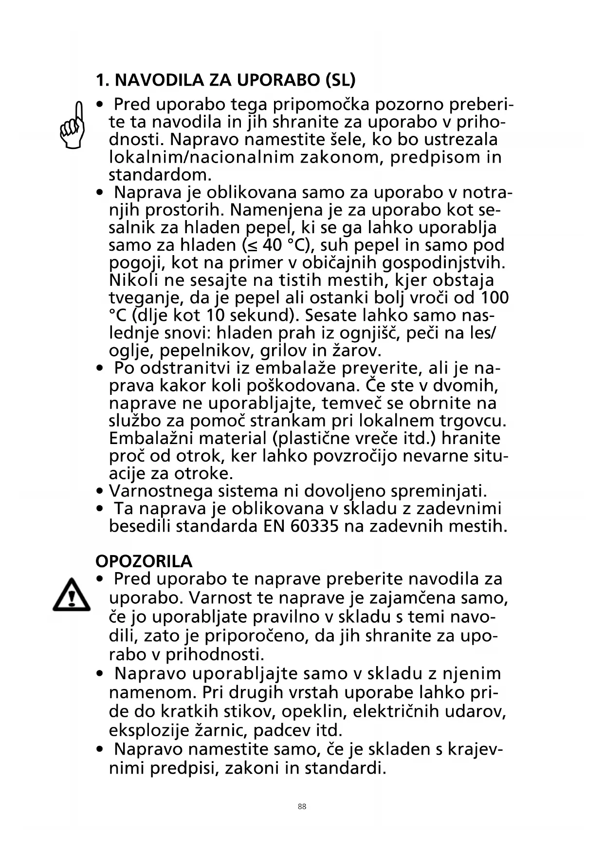 - Naprava je oblikovana samo za uporabo v notra- njih prostorih. Namenjena je za uporabo kot se- salnik za hladen pepel, ki se ga lahko uporablja samo za hladen (≤ 40 °C), suh pepel in samo pod pogoji, kot na primer v običajnih gospodinjstvih. Nikoli ne sesajte na tistih mestih, kjer obstaja tveganje, da je pepel ali ostanki bolj vroči od 100 °C (dlje kot 10 sekund). Sesate lahko samo nas- lednje snovi: hladen prah iz ognjišč, peči na les/ oglje, pepelnikov, grilov in žarov.