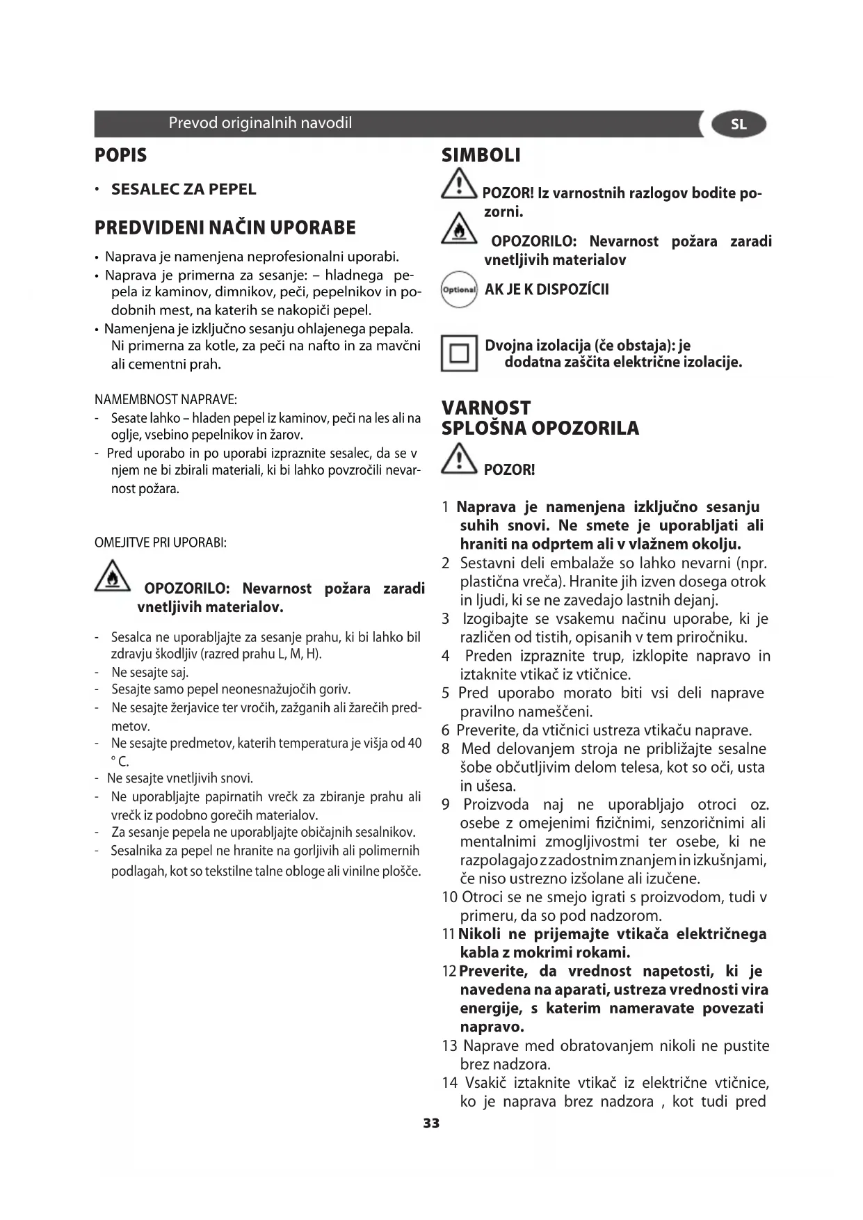 - Namenjena je izključno sesanju ohlajenega pepala. Ni primerna za kotle, za peči na nafto in za mavčni ali cementni prah. NAMEMBNOST NAPRAVE: - Sesate lahko – hladen pepel iz kaminov, peči na les ali na oglje, vsebino pepelnikov in žarov. - Pred uporabo in po uporabi izpraznite sesalec, da se v njem ne bi zbirali materiali, ki bi lahko povzročili nevar- nost požara. OMEJITVE PRI UPORABI: OPOZORILO: Nevarnost požara zaradi vnetljivih materialov. - Sesalca ne uporabljajte za sesanje prahu, ki bi lahko bil zdravju škodljiv (razred prahu L, M, H). - Ne sesajte saj. - Sesajte samo pepel neonesnažujočih goriv. - Ne sesajte žerjavice ter vročih, zažganih ali žarečih pred- metov. - Ne sesajte predmetov, katerih temperatura je višja od 40 ° C. - Ne sesajte vnetljivih snovi. - Ne uporabljajte papirnatih vrečk za zbiranje prahu ali vrečk iz podobno gorečih materialov. - Za sesanje pepela ne uporabljajte običajnih sesalnikov. - Sesalnika za pepel ne hranite na gorljivih ali polimernih podlagah, kot so tekstilne talne obloge ali vinilne plošče.