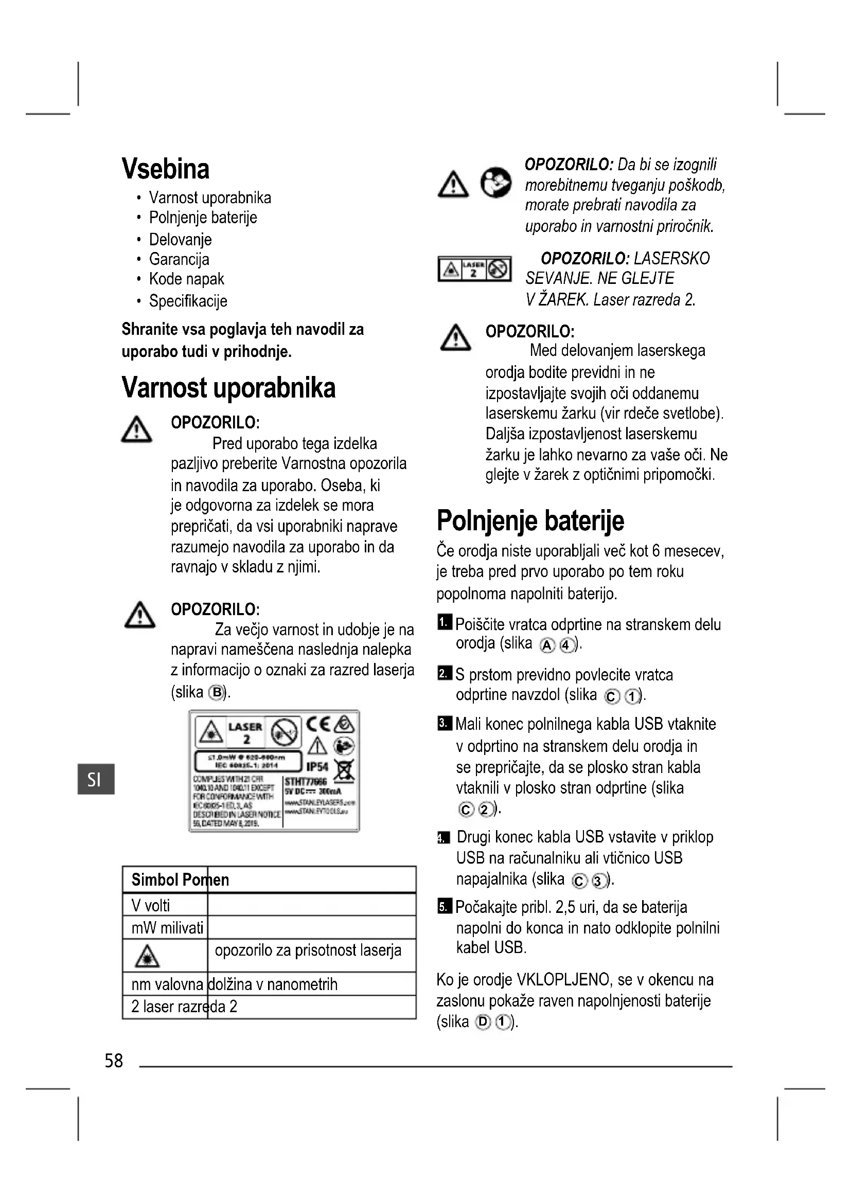 V ŽAREK. Laser razreda 2. OPOZORILO: Med delovanjem laserskega orodja bodite previdni in ne izpostavljajte svojih oči oddanemu laserskemu žarku (vir rdeče svetlobe). Daljša izpostavljenost laserskemu žarku je lahko nevarno za vaše oči. Ne glejte v žarek z optičnimi pripomočki. Polnjenje baterije Če orodja niste uporabljali več kot 6 mesecev, je treba pred prvo uporabo po tem roku popolnoma napolniti baterijo.