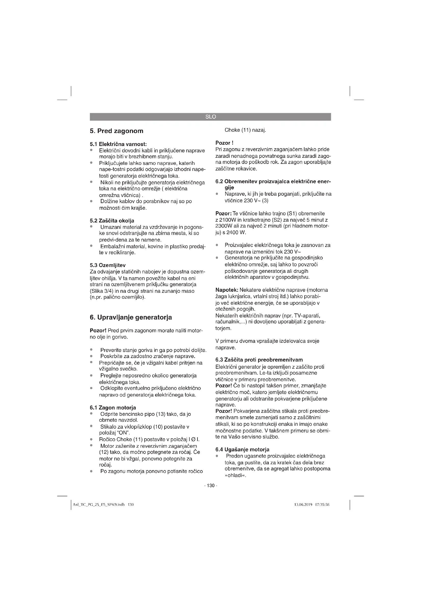 Električni generator je opremljen z zaščito proti preobremenitvam. Le-ta izključi posamezne vtičnice v primeru preobremenitve. Pozor! Če bi nastopil takšen primer, zmanjšajte električno moč, katero jemljete električnemu generatorju ali odstranite pokvarjene priključene naprave. Pozor! Pokvarjena zaščitna stikala proti preobre- menitvam smete zamenjati samo z zaščitnimi stikali, ki so po konstrukciji enaka in imajo enake močnostne podatke. V takšnem primeru se obrni- te na Vašo servisno službo.