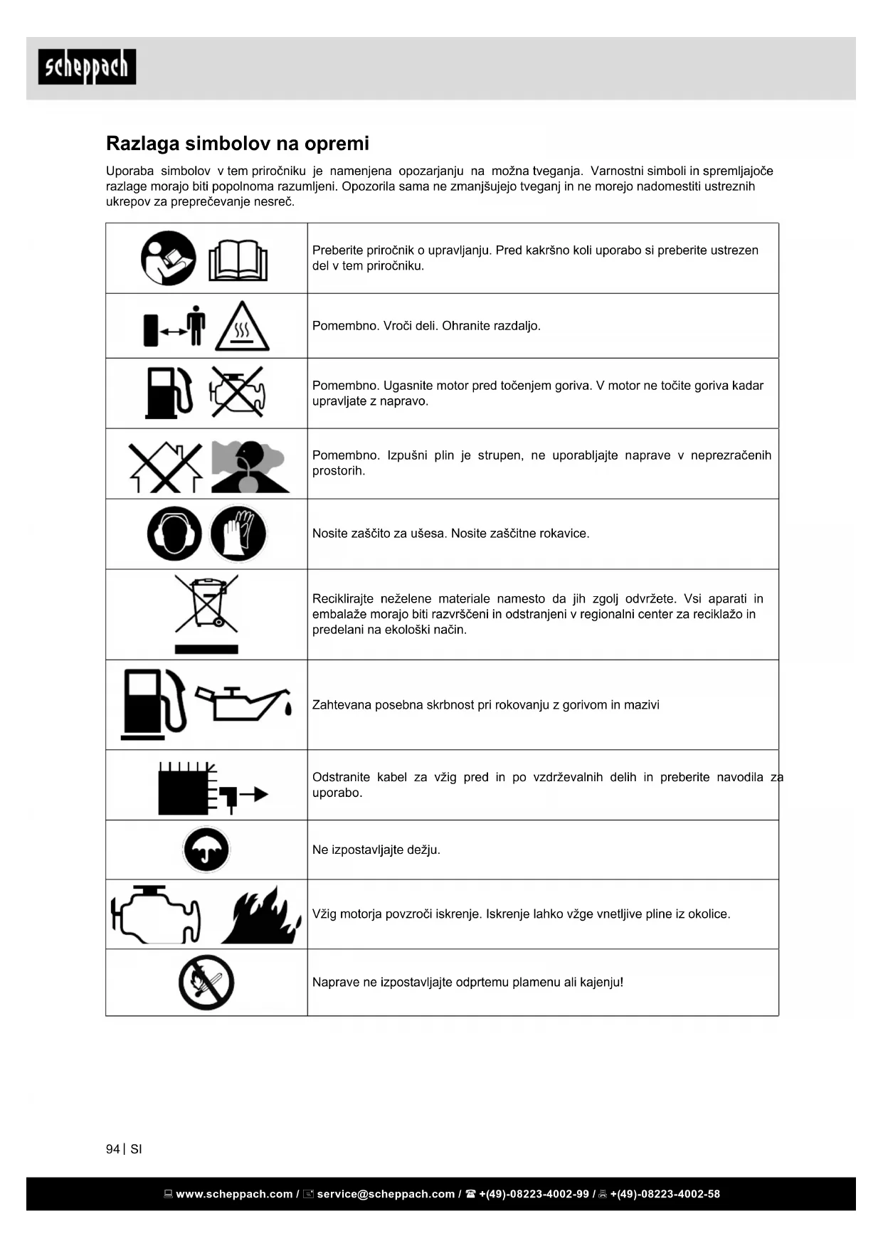 Razlaga simbolov na opremi Uporaba simbolov v tem priročniku je namenjena opozarjanju na možna tveganja. Varnostni simboli in spremljajoče razlage morajo biti popolnoma razumljeni. Opozorila sama ne zmanjšujejo tveganj in ne morejo nadomestiti ustreznih ukrepov za preprečevanje nesreč. Preberite priročnik o upravljanju. Pred kakršno koli uporabo si preberite ustrezen del v tem priročniku. Pomembno. Vroči deli. Ohranite razdaljo. Pomembno. Ugasnite motor pred točenjem goriva. V motor ne točite goriva kadar upravljate z napravo. Pomembno. Izpušni plin je strupen, ne uporabljajte naprave v neprezračenih prostorih. Nosite zaščito za ušesa. Nosite zaščitne rokavice. Reciklirajte neželene materiale namesto da jih zgolj odvržete. Vsi aparati in embalaže morajo biti razvrščeni in odstranjeni v regionalni center za reciklažo in predelani na ekološki način. Zahtevana posebna skrbnost pri rokovanju z gorivom in mazivi Odstranite kabel za vžig pred in po vzdrževalnih delih in preberite navodila za uporabo. Ne izpostavljajte dežju. Vžig motorja povzroči iskrenje. Iskrenje lahko vžge vnetljive pline iz okolice. Naprave ne izpostavljajte odprtemu plamenu ali kajenju! www.scheppach.com / service@scheppach.com / +(49)-08223-4002-99 / +(49)-08223-4002-58