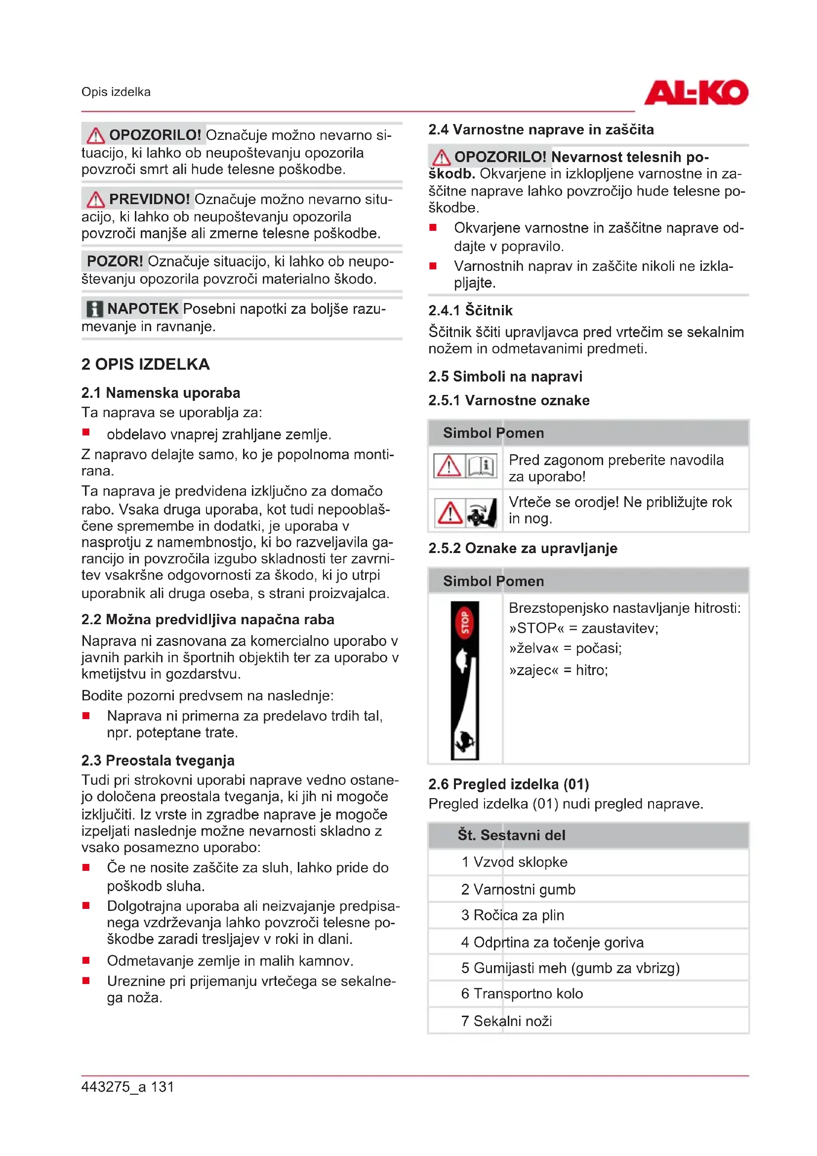 Pregled izdelka (01) nudi pregled naprave. Št. Sestavni del 1 Vzvod sklopke 2 Varnostni gumb 3 Ročica za plin 4 Odprtina za točenje goriva 5 Gumijasti meh (gumb za vbrizg) 6 Transportno kolo 7 Sekalni nožiSI 132 MH360 Varnostni napotki Št. Sestavni del 8 Zaporni vijak za olje 9 Ščitnik 10 Zavorna ostroga 11 Zaganjalna vrvica 12 Upravljalni ročaj 3 VARNOSTNI NAPOTKI NEVARNOST! Smrtna nevarnost in ne- varnost hudih telesnih poškodb! Nepoznava- nje varnostnih napotkov in navodil za upravljanje lahko povzroči zelo hude telesne poškodbe in po- sledično smrt.