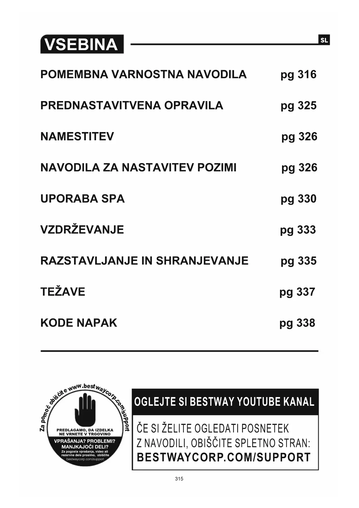 316VARNOSTNA NAVODILA Pred postavitvijo in uporabo tega masažnega bazena temeljito preberite ta uporabniški priročnik in dosledno upoštevajte vse v njem zapisane informacije. POMEMBNA VARNOSTNA NAVODILA – PREBERITE IN UPOŠTEVAJTE VSA NAVODILA. OPOZORILO: