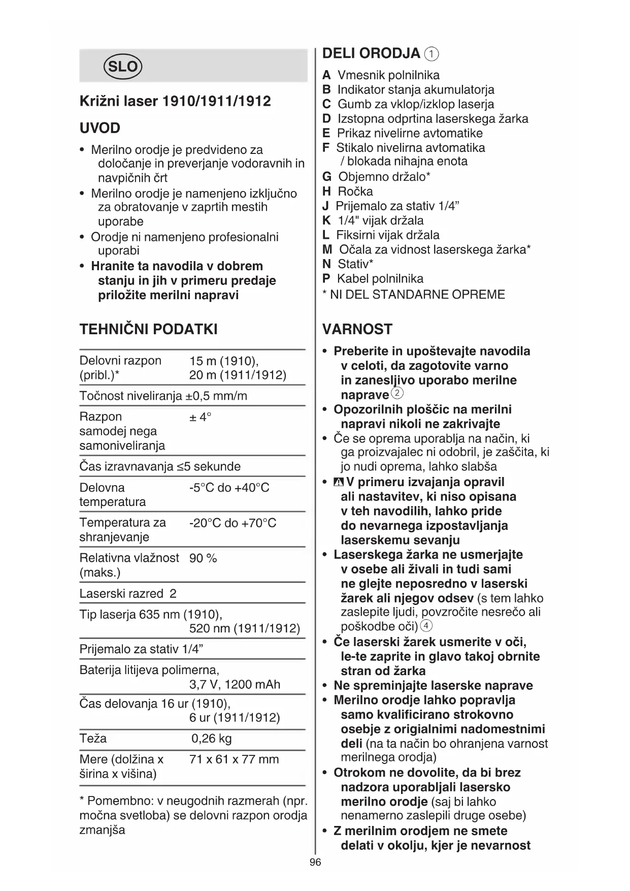 b, da zaklenete enoto za niveliranje, kadar UPORABLJATE samodejno niveliranje - vklopljenega merilnega orodja nikoli ne puščajte brez nadzorstva in ga po uporabi izklopite (laserski žarek lahko zaslepi druge osebe) - ko merilnega orodja ne uporabljate, ga izklopite, da bi tako privarčevali z energijo