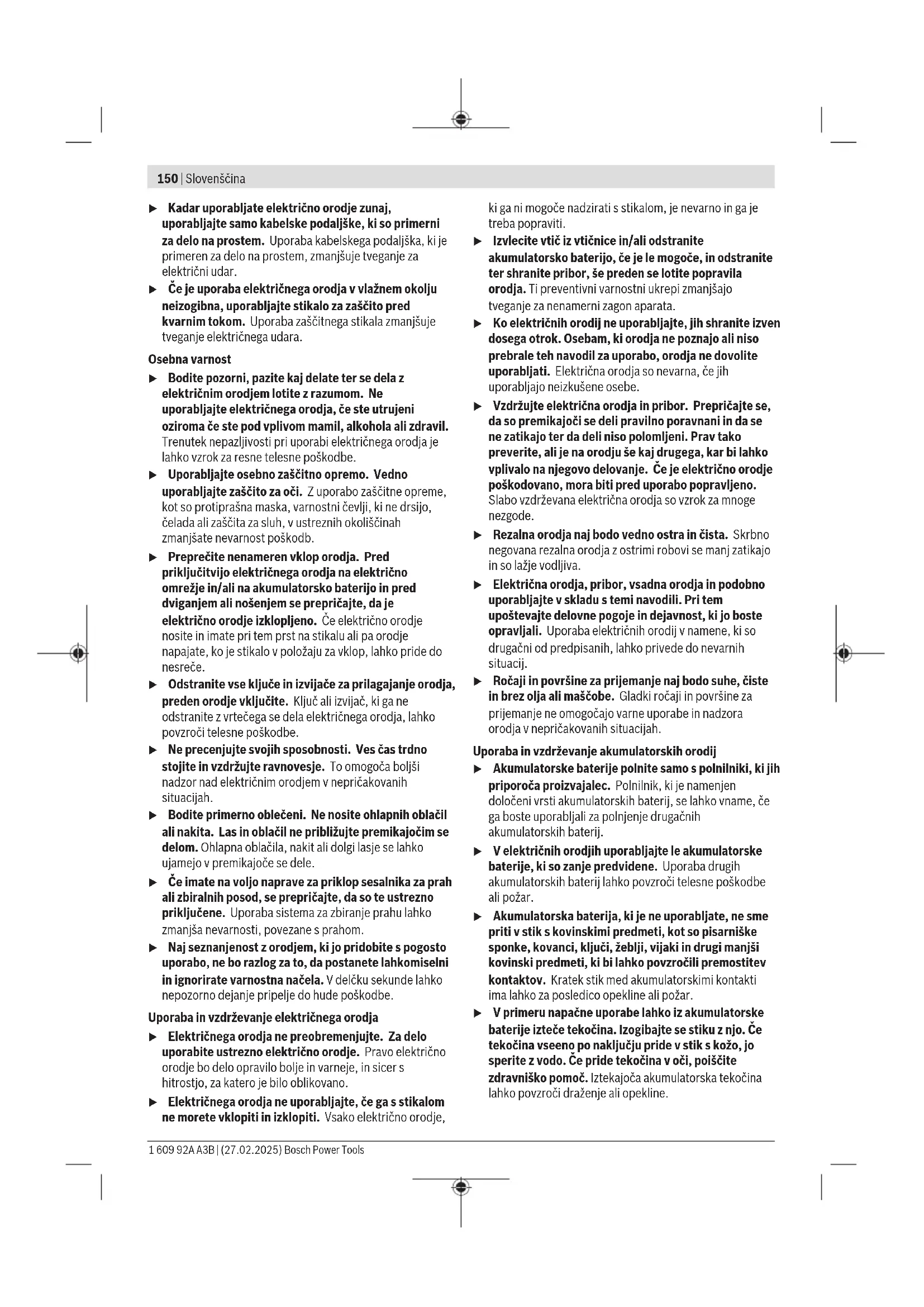 i na: www.bosch-pt.com/serviceaddresses Transport Sadržani litijum-jonski akumulatori podležu zahtevima zakona o opasnim materijalima. Korisnik može da transportuje akumulatore kopnenim putem bez dodatnih uslova. Kod slanja preko posrednika (npr.: vazdušnim transportom ili otpremom) treba poštovati posebne zahteve u pogledu pakovanja i označavanja. Pri tome je kod pripreme pošiljke potrebno angažovati stručnjaka za opasne materijale. Šaljite akumulatore samo ako je kućište neoštećeno. Otvorene kontakte odlepite i tako upakujte akumulator da se u pakovanju ne pokreće. Molimo da obratite pažnju i na eventualne dodatne nacionalne propise. Uklanjanje đubreta Električne alate, akumulacione baterije, pribor i pakovanja treba predati na reciklažu koja je u skladu sa zaštitom životne sredine. Ne bacajte električne alate i akumulatore/ baterije u kućno djubre! Samo za EU‑zemlje: Električni uređaji koji se više ne mogu koristiti i neispravni ili istrošeni akumulatori/baterije se moraju da se odlažu u otpad odvojeno. Koristite predviđene sisteme za sakupljanje. Ako se nepravilno zbrine, otpadna električna i elektronska oprema može imati štetne posledice po životnu sredinu i zdravlje ljudi zbog mogućeg prisustva opasnih materija. Akumulatorske baterije/baterije: Li-jonska: Molimo da obratite pažnju na napomene u odeljku Transport (videti „Transport“, Strana149). Slovenščina Varnostna opozorila Splošna varnostna navodila za električna orodja OPOZORILO Preberite vsa varnostna opozorila, navodila, ilustracije in specifikacije, ki so priložene temu električnemu orodju. Če spodaj navedenih napotkov ne upoštevate, lahko pride do električnega udara, požara in/ali težke poškodbe. Vsa opozorila in napotke shranite, ker jih boste v prihodnje še potrebovali. Pojem električno orodje, ki se pojavlja v nadaljnjem besedilu, se nanaša na električna orodja z električnim pogonom (z električnim kablom) in na akumulatorska električna orodja (brez električnega kabla). Varnost na delovnem mestu u Delovno mesto naj bo vedno čisto in dobro osvetljeno. Nered in neosvetljena delovna mesta povečajo možnost nezgod. u Električnega orodja ne uporabljajte v okolju, v katerem lahko pride do eksplozij (prisotnost vnetljivih tekočin, plinov ali prahu). Električna orodja povzročajo iskrenje, zaradi katerega se lahko prah ali hlapi vnamejo. u Ko uporabljate električno orodje, poskrbite, da v bližini ni otrok ali drugih oseb. Odvračanje pozornosti lahko povzroči izgubo nadzora nad orodjem. Električna varnost u Priključni vtič električnega orodja se mora prilegati vtičnici. Spreminjanje vtiča na kakršen koli način ni dovoljeno. Pri ozemljenih električnih orodjih ne uporabljajte adapterskih vtičev. Nespremenjeni vtiči in ustrezne vtičnice zmanjšujejo tveganje električnega udara. u Izogibajte se telesnemu stiku z ozemljenimi površinami, kot so na primer cevi, grelci, hladilniki in pašniki. Tveganje električnega udara je večje, če je vaše telo ozemljeno. u Prosimo, da napravo zavarujete pred dežjem ali vlago. Vdor vode v električno orodje povečuje tveganje za električni udar. u Kabel uporabljajte pravilno. Kabel zavarujte pred vročino, oljem, ostrimi robovi ali premikajočimi se deli. Poškodovani ali zapleteni kabli povečujejo tveganje električnega udara. Bosch Power Tools 1 609 92A A3B | (27.02.2025)150 | Slovenščina u Kadar uporabljate električno orodje zunaj, uporabljajte samo kabelske podaljške, ki so primerni za delo na prostem. Uporaba kabelskega podaljška, ki je primeren za delo na prostem, zmanjšuje tveganje za električni udar. u Če je uporaba električnega orodja v vlažnem okolju neizogibna, uporabljajte stikalo za zaščito pred kvarnim tokom. Uporaba zaščitnega stikala zmanjšuje tveganje električnega udara. Osebna varnost u Bodite pozorni, pazite kaj delate ter se dela z električnim orodjem lotite z razumom. Ne uporabljajte električnega orodja, če ste utrujeni oziroma če ste pod vplivom mamil, alkohola ali zdravil. Trenutek nepazljivosti pri uporabi električnega orodja je lahko vzrok za resne telesne poškodbe. u Uporabljajte osebno zaščitno opremo. Vedno uporabljajte zaščito za oči. Z uporabo zaščitne opreme, kot so protiprašna maska, varnostni čevlji, ki ne drsijo, čelada ali zaščita za sluh, v ustreznih okoliščinah zmanjšate nevarnost poškodb. u Preprečite nenameren vklop orodja. Pred priključitvijo električnega orodja na električno omrežje in/ali na akumulatorsko baterijo in pred dviganjem ali nošenjem se prepričajte, da je električno orodje izklopljeno. Če električno orodje nosite in imate pri tem prst na stikalu ali pa orodje napajate, ko je stikalo v položaju za vklop, lahko pride do nesreče. u Odstranite vse ključe in izvijače za prilagajanje orodja, preden orodje vključite. Ključ ali izvijač, ki ga ne odstranite z vrtečega se dela električnega orodja, lahko povzroči telesne poškodbe. u Ne precenjujte svojih sposobnosti. Ves čas trdno stojite in vzdržujte ravnovesje. To omogoča boljši nadzor nad električnim orodjem v nepričakovanih situacijah. u Bodite primerno oblečeni. Ne nosite ohlapnih oblačil ali nakita. Las in oblačil ne približujte premikajočim se delom. Ohlapna oblačila, nakit ali dolgi lasje se lahko ujamejo v premikajoče se dele. u Če imate na voljo naprave za priklop sesalnika za prah ali zbiralnih posod, se prepričajte, da so te ustrezno priključene. Uporaba sistema za zbiranje prahu lahko zmanjša nevarnosti, povezane s prahom. u Naj seznanjenost z orodjem, ki jo pridobite s pogosto uporabo, ne bo razlog za to, da postanete lahkomiselni in ignorirate varnostna načela. V delčku sekunde lahko nepozorno dejanje pripelje do hude poškodbe. Uporaba in vzdrževanje električnega orodja u Električnega orodja ne preobremenjujte. Za delo uporabite ustrezno električno orodje. Pravo električno orodje bo delo opravilo bolje in varneje, in sicer s 