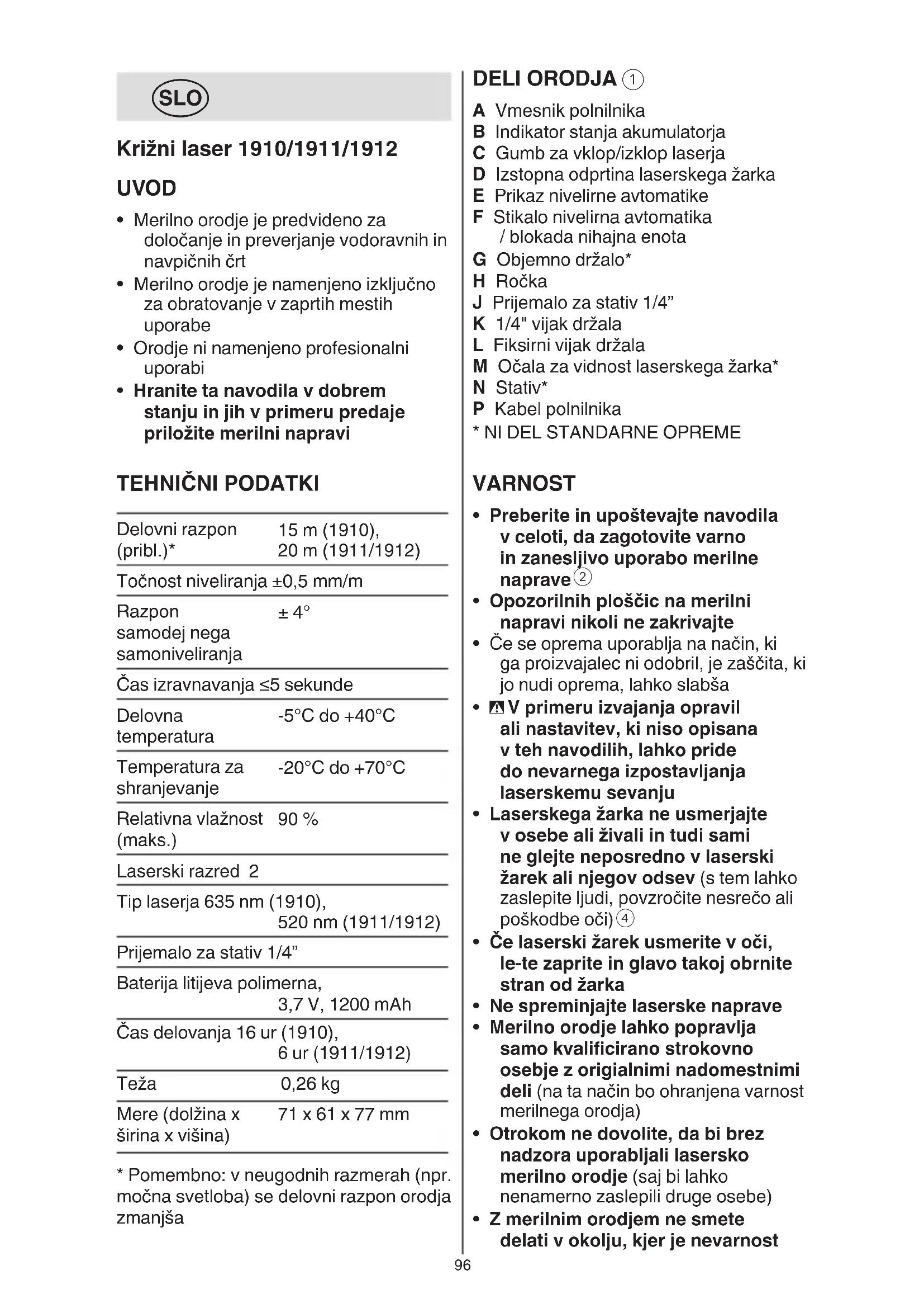b, da zaklenete enoto za niveliranje, kadar UPORABLJATE samodejno niveliranje - vklopljenega merilnega orodja nikoli ne puščajte brez nadzorstva in ga po uporabi izklopite (laserski žarek lahko zaslepi druge osebe) - ko merilnega orodja ne uporabljate, ga izklopite, da bi tako privarčevali z energijo