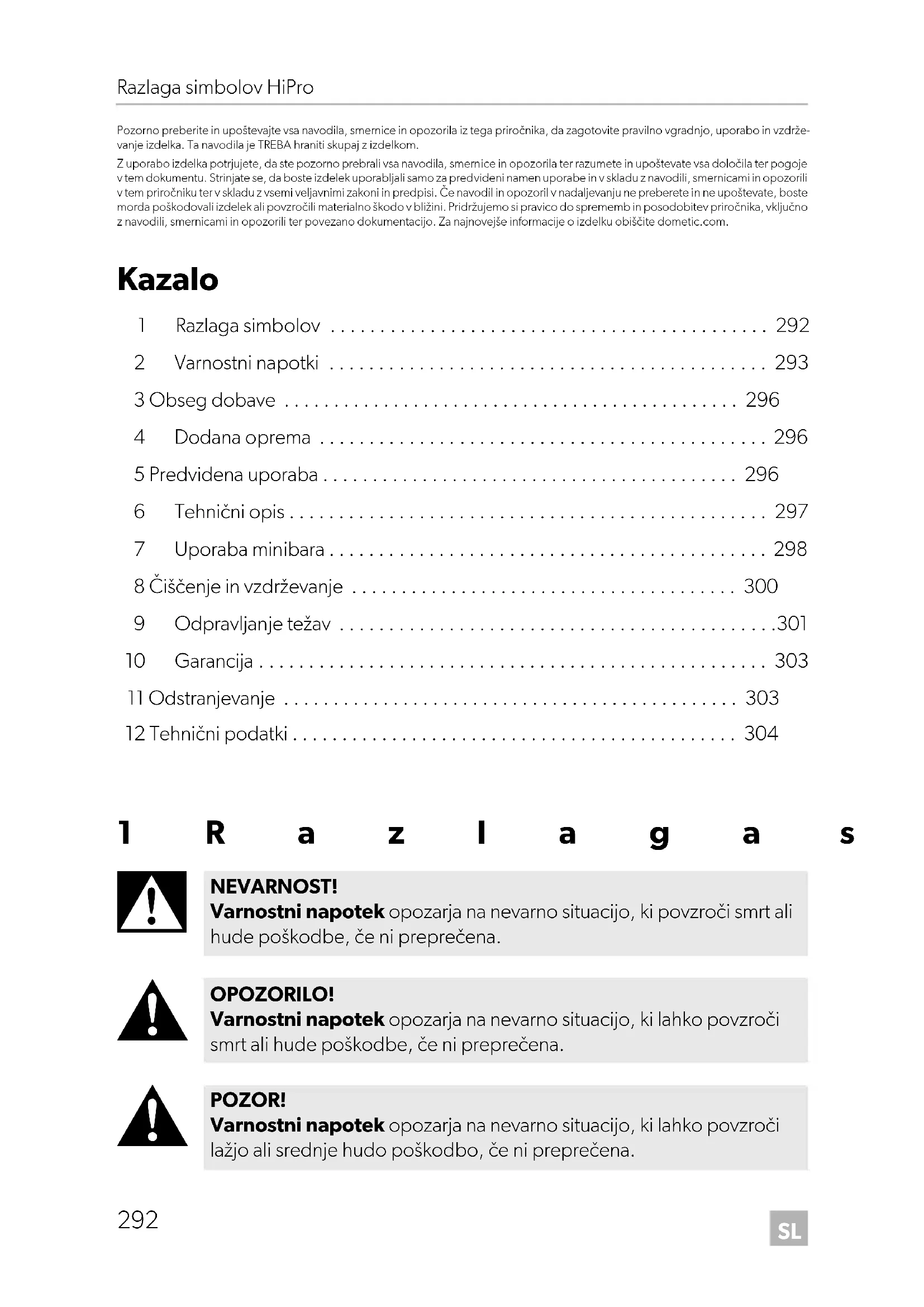 NEVARNOST! Varnostni napotek opozarja na nevarno situacijo, ki povzroči smrt ali hude poškodbe, če ni preprečena. OPOZORILO! Varnostni napotek opozarja na nevarno situacijo, ki lahko povzroči smrt ali hude poškodbe, če ni preprečena. POZOR! Varnostni napotek opozarja na nevarno situacijo, ki lahko povzroči lažjo ali srednje hudo poškodbo, če ni preprečena. DometicHiPro30-40_OPM_4445103227_EMEA25_xxxx-xx-xx.book Seite 292 Freitag, 16. April 2021 2:47 14SL HiPro Varnostni napotki