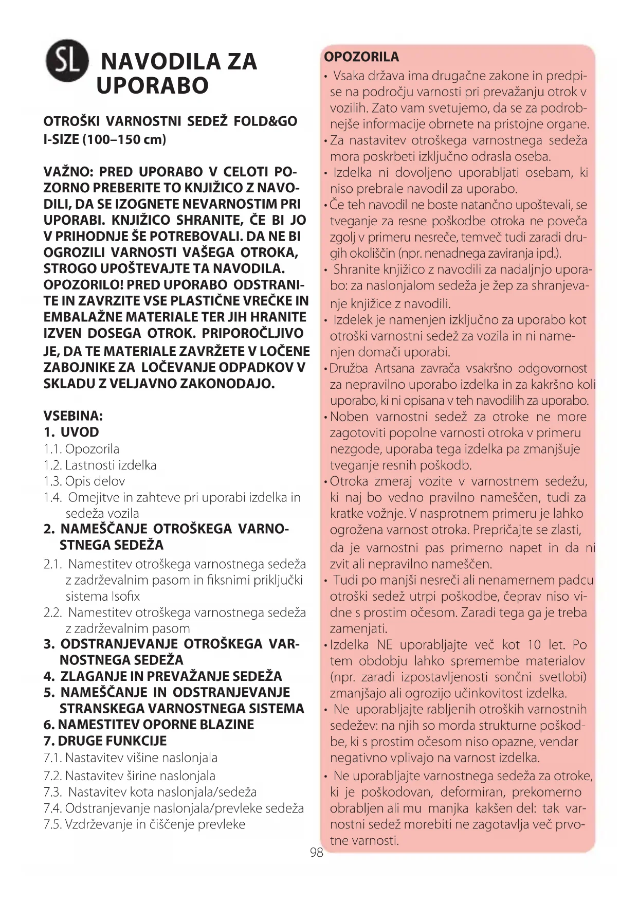 - Izdelek je namenjen izključno za uporabo kot otroški varnostni sedež za vozila in ni name- njen domači uporabi.