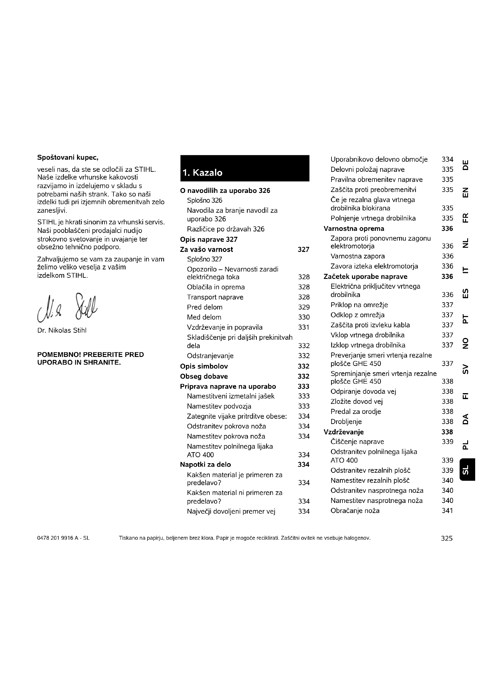 DEENFRNLITESPTNOSVFIDAPL SL 0478 201 9916 A - SL Spoštovani kupec, veseli nas, da ste se odločili za STIHL. Naše izdelke vrhunske kakovosti razvijamo in izdelujemo v skladu s potrebami naših strank. Tako so naši izdelki tudi pri izjemnih obremenitvah zelo zanesljivi. STIHL je hkrati sinonim za vrhunski servis. Naši pooblaščeni prodajalci nudijo strokovno svetovanje in uvajanje ter obsežno tehnično podporo. Zahvaljujemo se vam za zaupanje in vam želimo veliko veselja z vašim izdelkom STIHL. Dr. Nikolas Stihl