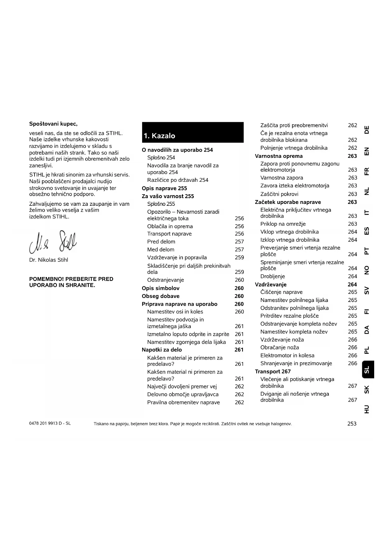 DEENFRNLITESPTNOSVFIDAPLSKHU SL 0478 201 9913 D - SL Spoštovani kupec, veseli nas, da ste se odločili za STIHL. Naše izdelke vrhunske kakovosti razvijamo in izdelujemo v skladu s potrebami naših strank. Tako so naši izdelki tudi pri izjemnih obremenitvah zelo zanesljivi. STIHL je hkrati sinonim za vrhunski servis. Naši pooblaščeni prodajalci nudijo strokovno svetovanje in uvajanje ter obsežno tehnično podporo. Zahvaljujemo se vam za zaupanje in vam želimo veliko veselja z vašim izdelkom STIHL. Dr. Nikolas Stihl