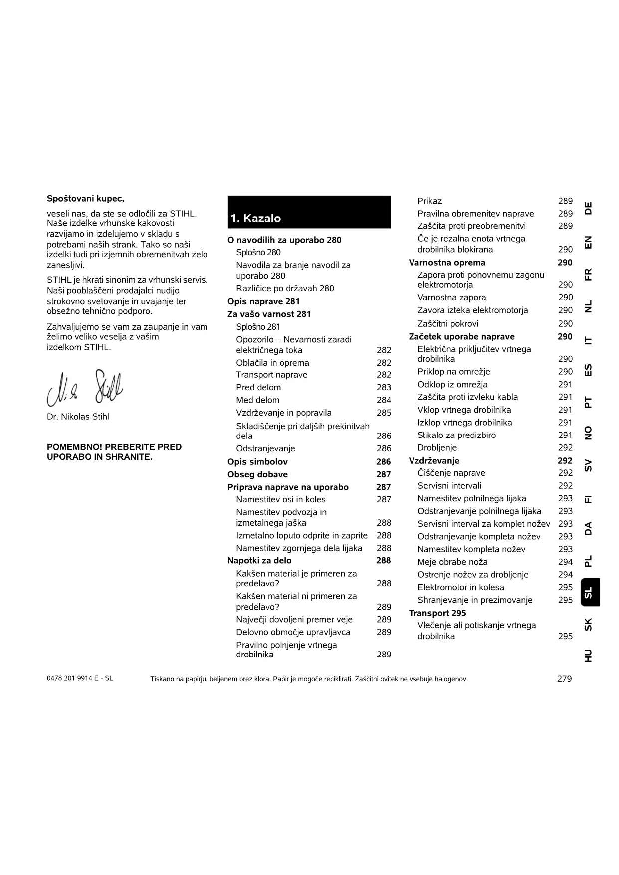 DEENFRNLITESPTNOSVFIDAPLSKHU SL 0478 201 9914 E - SL Spoštovani kupec, veseli nas, da ste se odločili za STIHL. Naše izdelke vrhunske kakovosti razvijamo in izdelujemo v skladu s potrebami naših strank. Tako so naši izdelki tudi pri izjemnih obremenitvah zelo zanesljivi. STIHL je hkrati sinonim za vrhunski servis. Naši pooblaščeni prodajalci nudijo strokovno svetovanje in uvajanje ter obsežno tehnično podporo. Zahvaljujemo se vam za zaupanje in vam želimo veliko veselja z vašim izdelkom STIHL. Dr. Nikolas Stihl