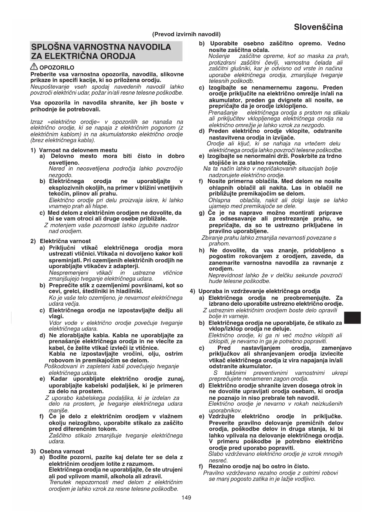 a) Bodite pozorni, pazite kaj delate ter se dela z električnim orodjem lotite z razumom. Električnega orodja ne uporabljajte, če ste utrujeni ali pod vplivom mamil, alkohola ali zdravil. Trenutek nepozornosti med delom z električnim orodjem je lahko vzrok za resne telesne poškodbe. (Prevod izvirnih navodil) 0000BookC18DSL.indb1490000BookC18DSL.indb149 2019/02/2215:07:022019/02/2215:07:02150 Slovenščina g) Električno orodje, pribor, vsadna orodja in podobno uporabljajte v skladu s temi navodili, pri čemer upoštevajte delovne pogoje in dejavnost, ki jo boste opravljali. Uporabo električnega orodja v druge namene lahko privede do nevarne situacije. h) Ročaji in prijemalne površine naj bodo suhe, čiste in brez olja in masti. Spolzki ročaji in prijemalne površine ne omogočajo varnega ravnanja in nadzora orodja v nepričakovanih situacijah.