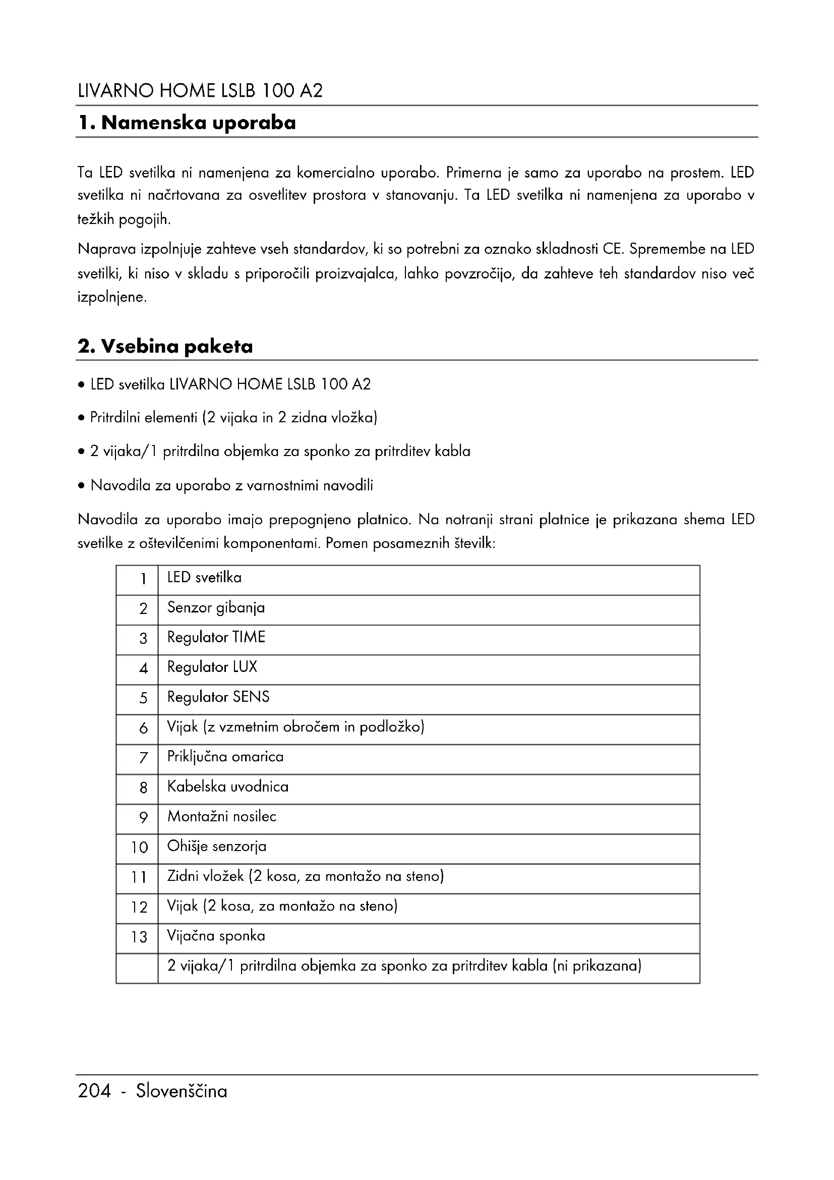 Pred prvo uporabo LED svetilke (1) preberite naslednja navodila ter upoštevajte vsa opozorila, tudi če ste dobro seznanjeni z upravljanjem elektronskih naprav. Navodila za uporabo shranite na varnem mestu za kasnejšo uporabo. V primeru, ko napravo prodate ali izročite drugi osebi, obvezno priložite tudi ta priročnik. Razlaga uporabljenih simbolov Razbite varnostne pokrove obvezno zamenjajte. LED svetilka (1) ima ozemljitveni vodnik. Ozemljitveni vodnik (rumeno-zelen) mora biti priključen na označeno vijačno sponko (13). NEVARNOST! Ta opozorilna beseda označuje nevarnost z visokim tveganjem, ki povzroči smrt ali težje telesne poškodbe, če se ji ne izognete. OPOZORILO! Ta opozorilna beseda označuje nevarnost s srednje velikim tveganjem, ki lahko povzroči smrt ali težje telesne poškodbe, če se ji ne izognete. PREVIDNOST! Ta opozorilna beseda označuje pomembna navodila za zaščito pred škodo na opremi. NEVARNOST! Ta simbol opozarja na škodljivo električno napetost! Simbol označuje dodatne informacije o zadevi. Ni primeren za notranjo osvetlitev v stanovanju.LIVARNO HOME LSLB 100 A2 Slovenščina - 207 LED svetilke ni možno zatemniti. Kot snopa LED svetilke je približno 120°. Do 80% prihranka energije v primerjavi s 500-W halogenskim reflektorjem. Čas osvetlitve se lahko nastavi od približno 5 sekund do 5 minut. Senzor gibanja se lahko vrti. Skupni svetlobni tok je približno 10000 lm/100 W Odporna na vremenske vplive in brizgajočo vodo (IP44) Doseg zaznavanja senzorja gibanja je približno 8 m.
