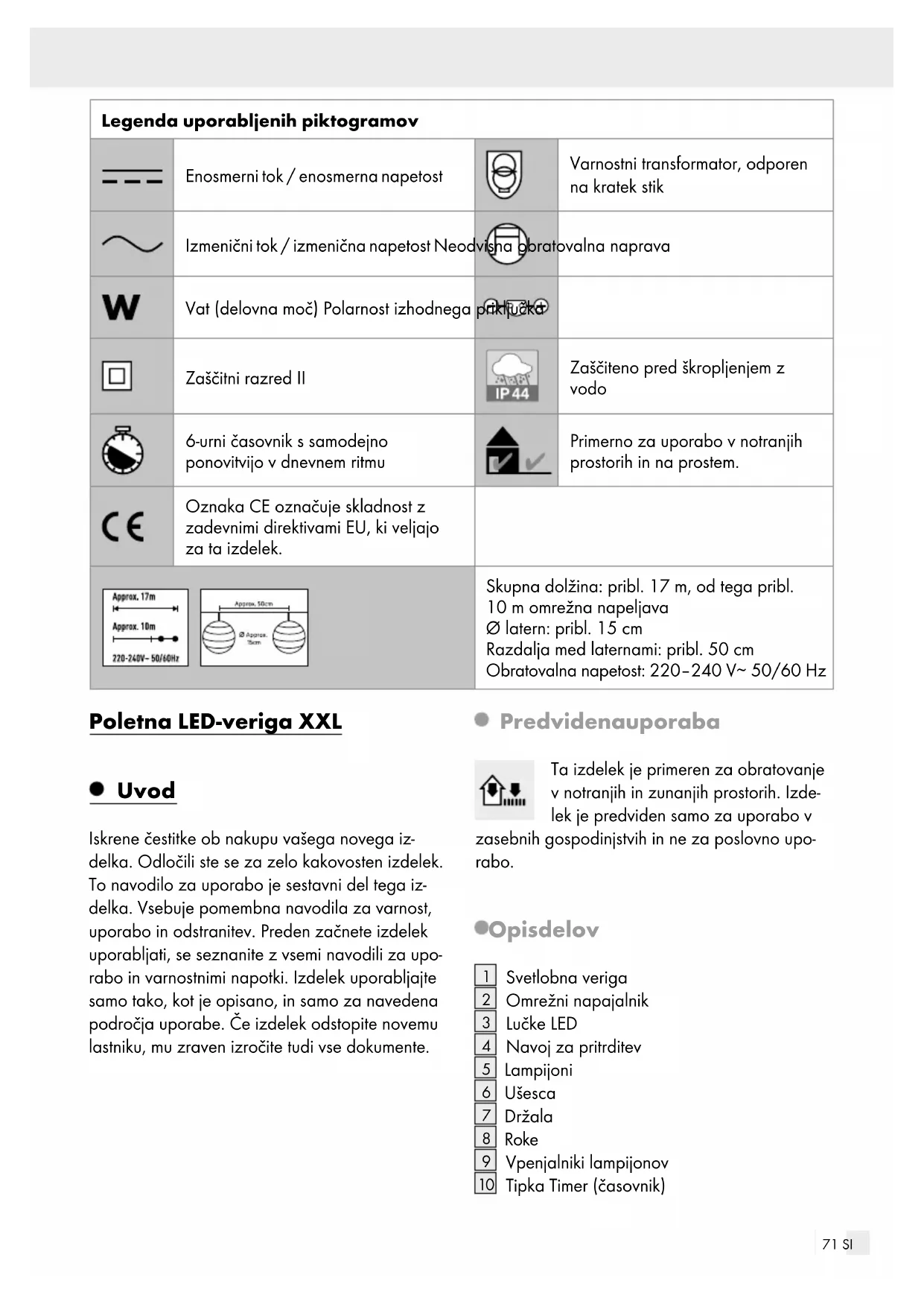 Tipka Timer (časovnik)72 SI Tehnični podatki Svetlobna veriga + omrežni napajalnik: Poraba moči skupaj: pribl. 2,0 W Svetlobna veriga: Obratovalna napetost: 4,5 V Lučke LED: skupaj 15 lučk LED: 1,35 W (lučk LED ni mogoče zamenjati.) Vrsta zaščite: IP44 (zaščiteno pred škropljenjem z vodo) Svetlobna veriga (št. modela HG06009A / HG06009C) s certifikatom GS Omrežni napajalnik: Primarna nazivna napetost: 220‒240 V∼, 50/60 Hz Sekundarna nazivna napetost: 4,5 V , 1,35 W Zaščitni razred: II / Vrsta zaščite: IP44 (zaščiteno pred škropljenjem z vodo) Omrežni napajalnik (št. modela S0135G045W2D) s certifikatom GS SELV: Zaščitna nizka napetost (Safety extra low voltage) Ta: Največja temperatura okolice Tc: Maks. temperatura ohišja predvklopne naprave Obseg dobave 1 poletna svetlobna veriga LED XXL 15 latern 1 omrežni napajalnik 1 navodilo za uporabo Varnostni napotki