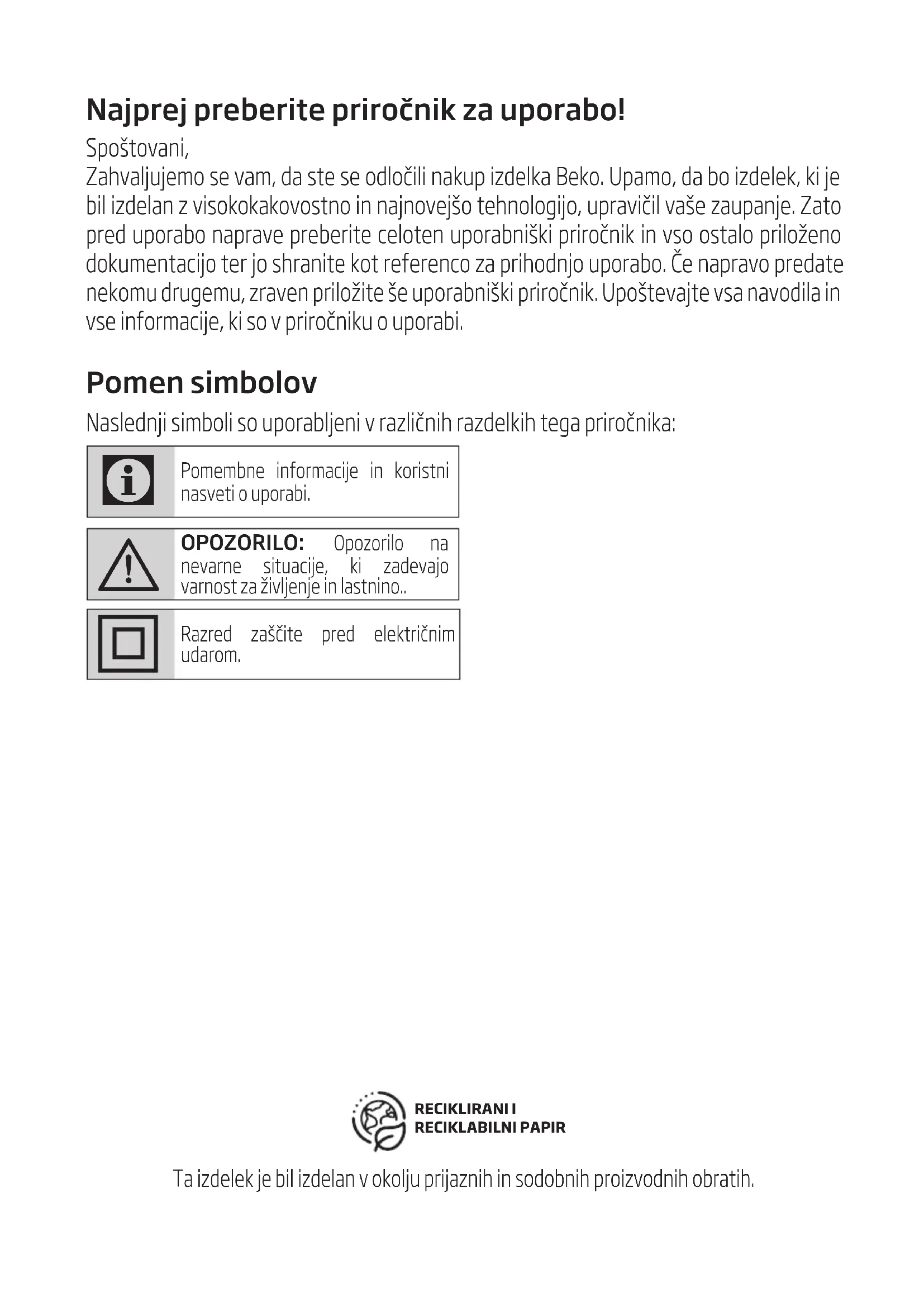 Pomembne informacije in koristni nasveti o uporabi. OPOZORILO: Opozorilo na nevarne situacije, ki zadevajo varnost za življenje in lastnino..Razred zaščite pred električnim udarom. Ta izdelek je bil izdelan v okolju prijaznih in sodobnih proizvodnih obratih.