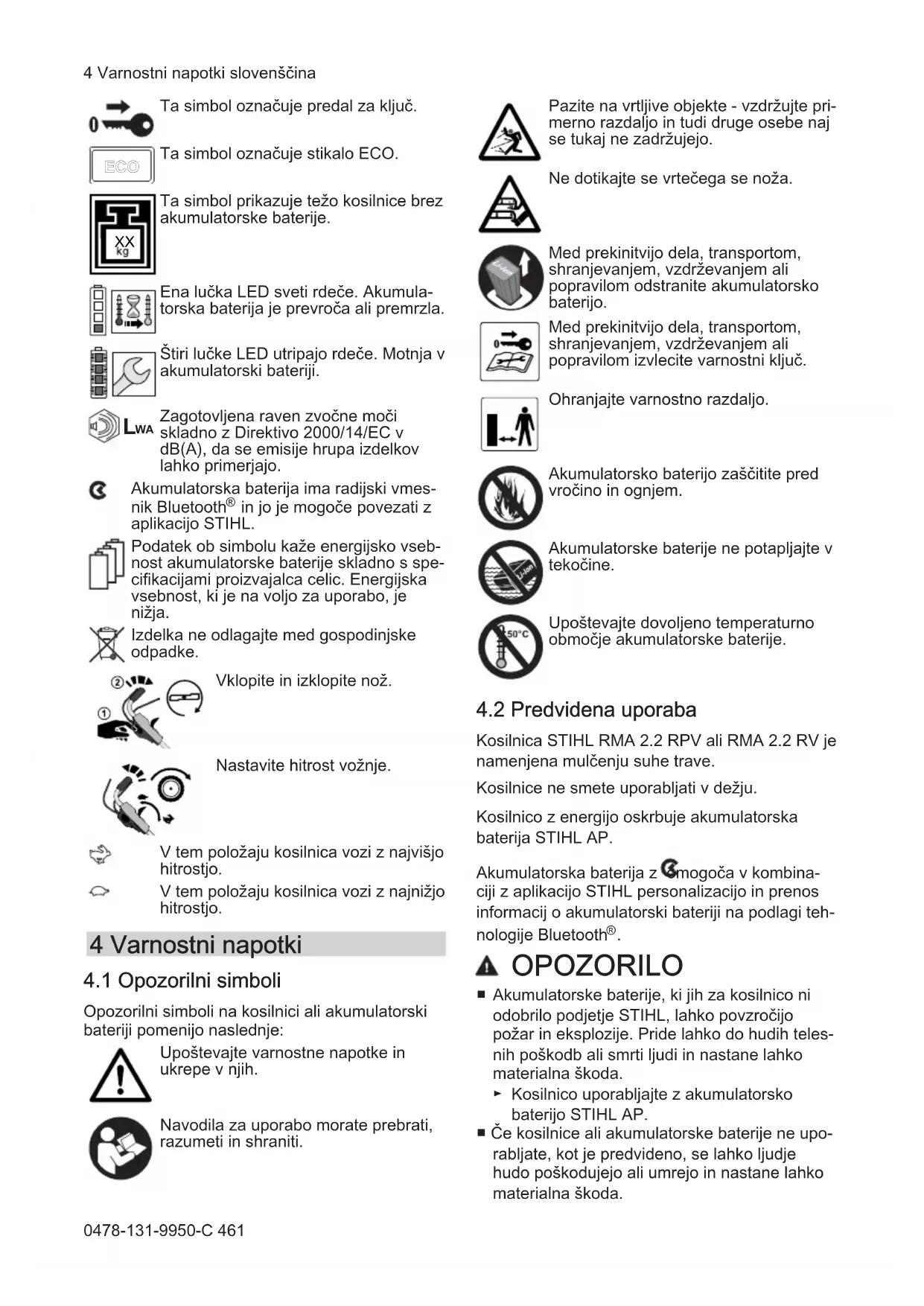 OPOZORILO ■ Nepoučeni uporabniki ne morejo prepoznati in oceniti nevarnosti v zvezi s kosilnico in akumu‐ latorsko baterijo. Uporabnik in drugi se lahko hudo poškodujejo in umrejo. ► Navodila za uporabo morate pre‐ brati, razumeti in shraniti. ► Če kosilnico ali akumulatorsko baterijo predate drugi osebi: priložite navodila za uporabo.