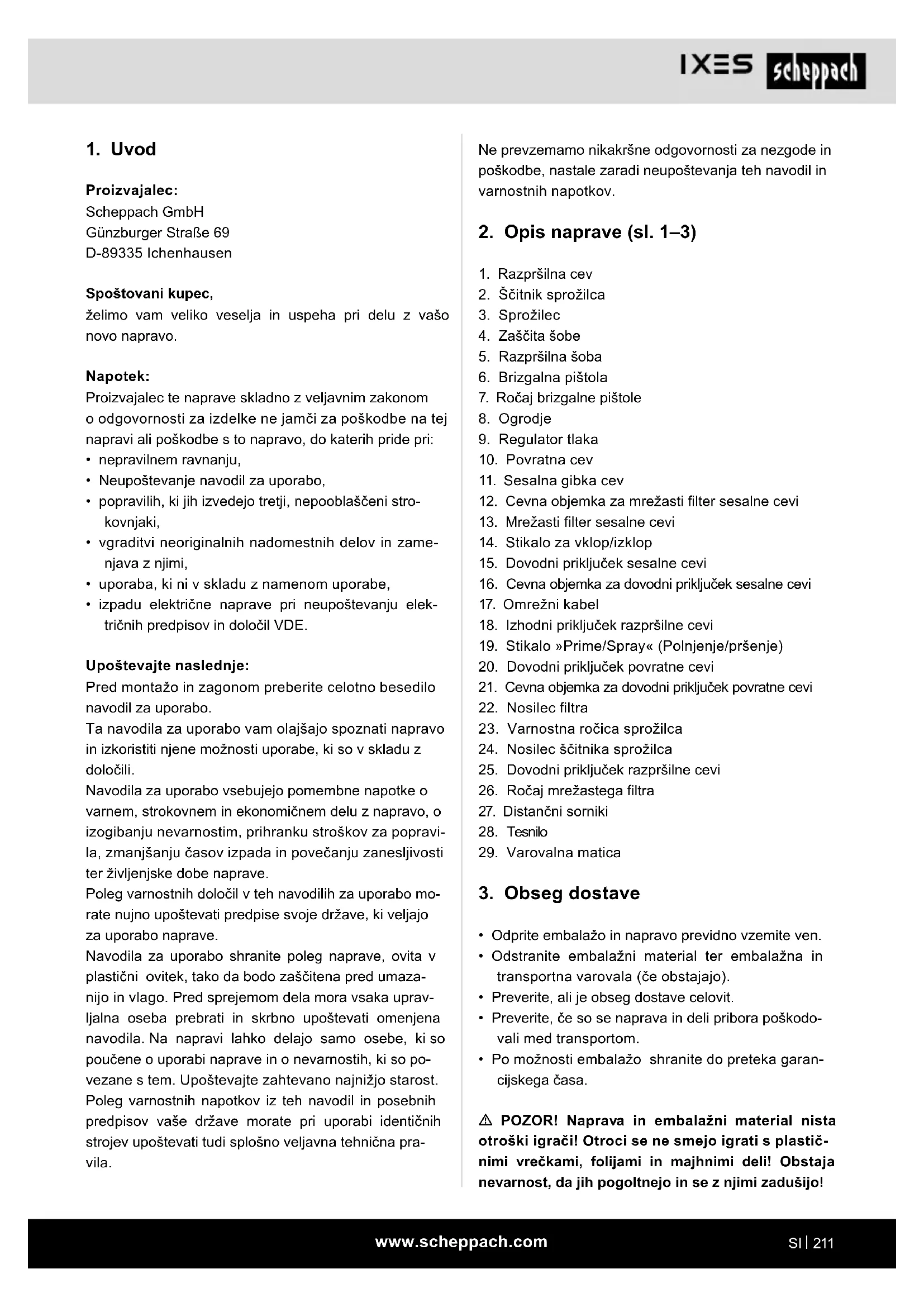 - izpadu električne naprave pri neupoštevanju elek- tričnih predpisov in določil VDE. Upoštevajte naslednje: Pred montažo in zagonom preberite celotno besedilo navodil za uporabo. Ta navodila za uporabo vam olajšajo spoznati napravo in izkoristiti njene možnosti uporabe, ki so v skladu z določili. Navodila za uporabo vsebujejo pomembne napotke o varnem, strokovnem in ekonomičnem delu z napravo, o izogibanju nevarnostim, prihranku stroškov za popravi- la, zmanjšanju časov izpada in povečanju zanesljivosti ter življenjske dobe naprave. Poleg varnostnih določil v teh navodilih za uporabo mo- rate nujno upoštevati predpise svoje države, ki veljajo za uporabo naprave. Navodila za uporabo shranite poleg naprave, ovita v plastični ovitek, tako da bodo zaščitena pred umaza- nijo in vlago. Pred sprejemom dela mora vsaka uprav- ljalna oseba prebrati in skrbno upoštevati omenjena navodila. Na napravi lahko delajo samo osebe, ki so poučene o uporabi naprave in o nevarnostih, ki so po- vezane s tem. Upoštevajte zahtevano najnižjo starost. Poleg varnostnih napotkov iz teh navodil in posebnih predpisov vaše države morate pri uporabi identičnih strojev upoštevati tudi splošno veljavna tehnična pra- vila.www.scheppach.com