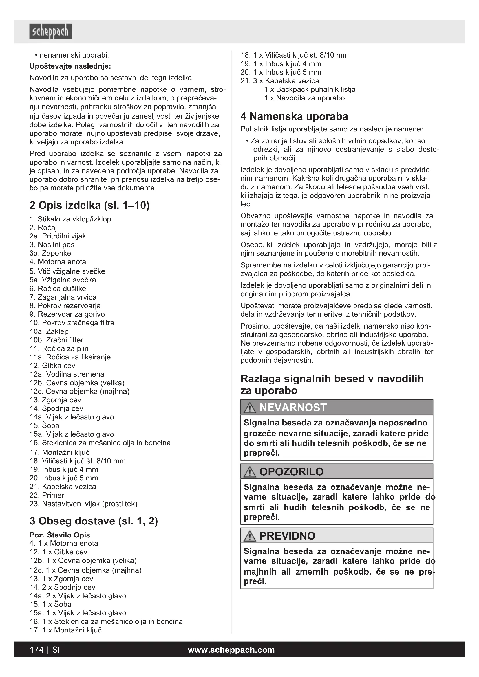 - Za zbiranje listov ali splošnih vrtnih odpadkov, kot so odrezki, ali za njihovo odstranjevanje s slabo dosto- pnih območij. Izdelek je dovoljeno uporabljati samo v skladu s predvide- nim namenom. Kakršna koli drugačna uporaba ni v skla- du z namenom. Za škodo ali telesne poškodbe vseh vrst, ki izhajajo iz tega, je odgovoren uporabnik in ne proizvaja- lec. Obvezno upoštevajte varnostne napotke in navodila za montažo ter navodila za uporabo v priročniku za uporabo, saj lahko le tako omogočite ustrezno uporabo. Osebe, ki izdelek uporabljajo in vzdržujejo, morajo biti z njim seznanjene in poučene o morebitnih nevarnostih. Spremembe na izdelku v celoti izključujejo garancijo proi- zvajalca za poškodbe, do katerih pride kot posledica. Izdelek je dovoljeno uporabljati samo z originalnimi deli in originalnim priborom proizvajalca. Upoštevati morate proizvajalčeve predpise glede varnosti, dela in vzdrževanja ter meritve iz tehničnih podatkov. Prosimo, upoštevajte, da naši izdelki namensko niso kon- struirani za gospodarsko, obrtno ali industrijsko uporabo. Ne prevzemamo nobene odgovornosti, če izdelek uporab- ljate v gospodarskih, obrtnih ali industrijskih obratih ter podobnih dejavnostih. Razlaga signalnih besed v navodilih za uporabo NEVARNOST Signalna beseda za označevanje neposredno grozeče nevarne situacije, zaradi katere pride do smrti ali hudih telesnih poškodb, če se ne prepreči. OPOZORILO Signalna beseda za označevanje možne ne- varne situacije, zaradi katere lahko pride do smrti ali hudih telesnih poškodb, če se ne prepreči. PREVIDNO Signalna beseda za označevanje možne ne- varne situacije, zaradi katere lahko pride do majhnih ali zmernih poškodb, če se ne pre- preči. 174 | SI www.scheppach.comPOZOR Signalna beseda za označevanje možne ne- varne situacije, zaradi katere lahko pride do materialne škode na izdelku ali lastnini, če se ne prepreči. 5 Varnostni napotki Splošni varnostni napotki OPOZORILO Pred zagonom izdelka zaradi lastne varnosti temeljito preberite ta priročnik in splošne varnostne napotke. Če izdelek prepustite tretjim osebam, vedno priložite ta na- vodila za uporabo. OPOZORILO Uporabljajte samo goriva, ki so priporočena v navodilih. OPOZORILO Nikoli ne uporabljajte goriva, ki ni mešano z 2-taktnim oljem. To lahko povzroči trajne poškodbe motorja in iz- ključuje garancijo proizvajalca za ta izdelek. Nikoli ne uporabljajte mešanice goriva, ki je bila skladiščena več kot 90dni. Hranite vse varnostne napotke in navodila za prihodnjo rabo!