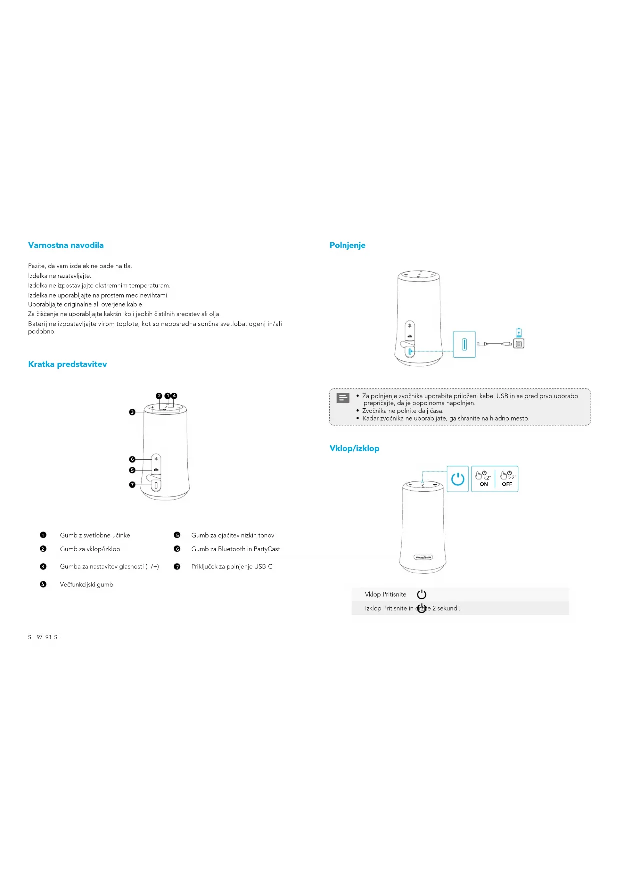 - Za polnjenje zvočnika uporabite priloženi kabel USB in se pred prvo uporabo prepričajte, da je popolnoma napolnjen.