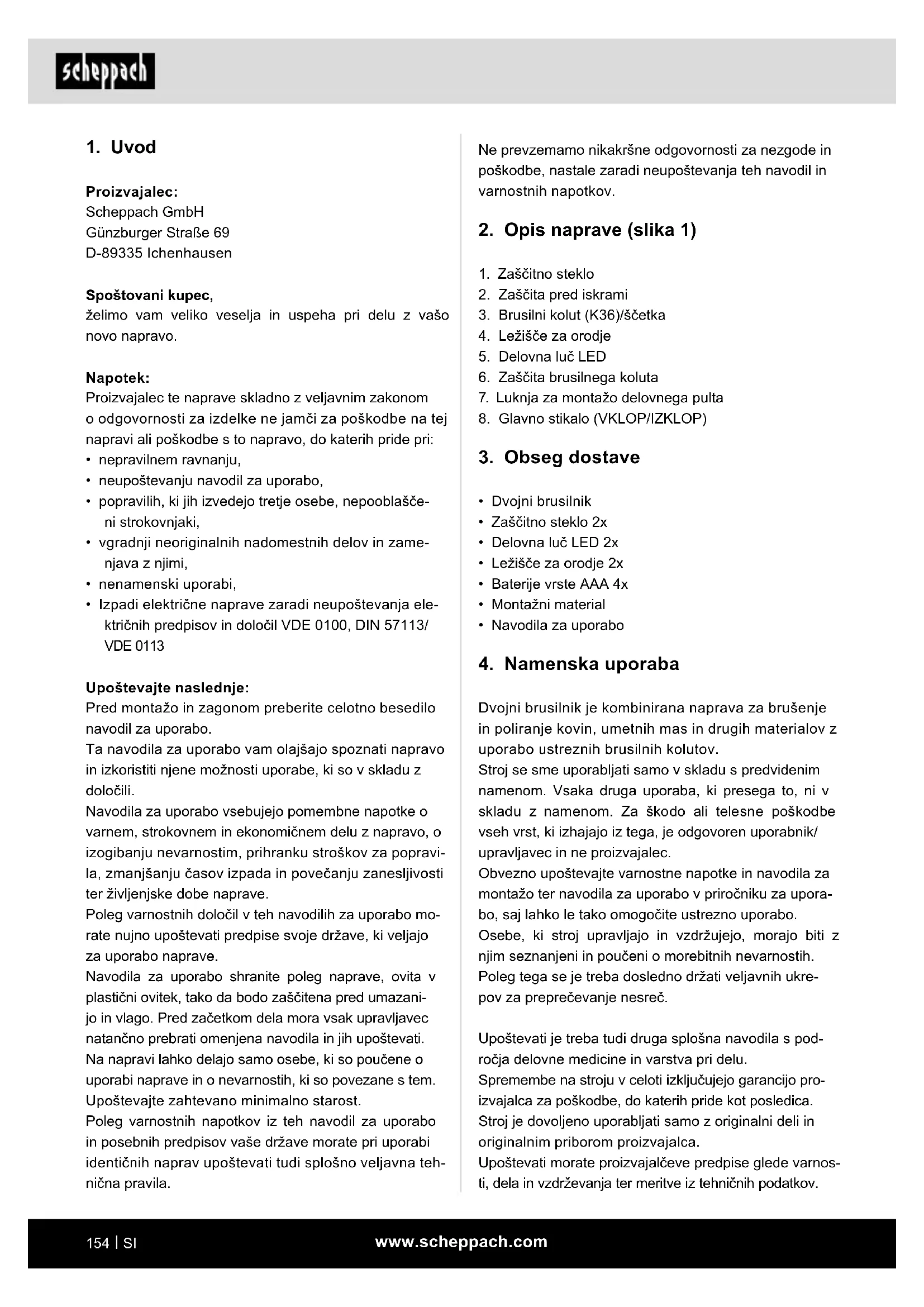 - Izpadi električne naprave zaradi neupoštevanja ele- ktričnih predpisov in določil VDE 0100, DIN 57113/ VDE 0113 Upoštevajte naslednje: Pred montažo in zagonom preberite celotno besedilo navodil za uporabo. Ta navodila za uporabo vam olajšajo spoznati napravo in izkoristiti njene možnosti uporabe, ki so v skladu z določili. Navodila za uporabo vsebujejo pomembne napotke o varnem, strokovnem in ekonomičnem delu z napravo, o izogibanju nevarnostim, prihranku stroškov za popravi- la, zmanjšanju časov izpada in povečanju zanesljivosti ter življenjske dobe naprave. Poleg varnostnih določil v teh navodilih za uporabo mo- rate nujno upoštevati predpise svoje države, ki veljajo za uporabo naprave. Navodila za uporabo shranite poleg naprave, ovita v plastični ovitek, tako da bodo zaščitena pred umazani- jo in vlago. Pred začetkom dela mora vsak upravljavec natančno prebrati omenjena navodila in jih upoštevati. Na napravi lahko delajo samo osebe, ki so poučene o uporabi naprave in o nevarnostih, ki so povezane s tem. Upoštevajte zahtevano minimalno starost. Poleg varnostnih napotkov iz teh navodil za uporabo in posebnih predpisov vaše države morate pri uporabi identičnih naprav upoštevati tudi splošno veljavna teh- nična pravila.www.scheppach.com