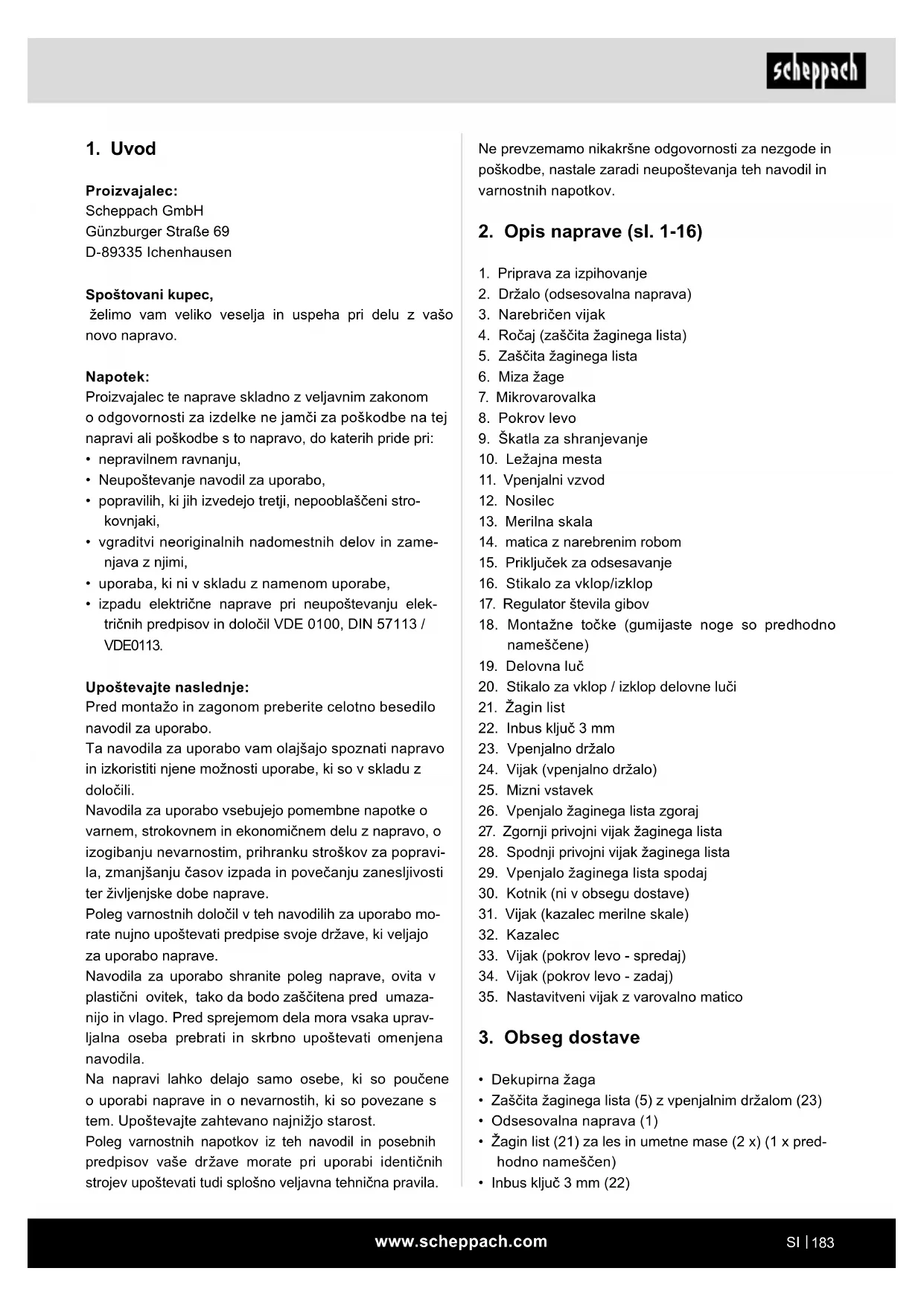 - izpadu električne naprave pri neupoštevanju elek- tričnih predpisov in določil VDE 0100, DIN 57113 / VDE0113. Upoštevajte naslednje: Pred montažo in zagonom preberite celotno besedilo navodil za uporabo. Ta navodila za uporabo vam olajšajo spoznati napravo in izkoristiti njene možnosti uporabe, ki so v skladu z določili. Navodila za uporabo vsebujejo pomembne napotke o varnem, strokovnem in ekonomičnem delu z napravo, o izogibanju nevarnostim, prihranku stroškov za popravi- la, zmanjšanju časov izpada in povečanju zanesljivosti ter življenjske dobe naprave. Poleg varnostnih določil v teh navodilih za uporabo mo- rate nujno upoštevati predpise svoje države, ki veljajo za uporabo naprave. Navodila za uporabo shranite poleg naprave, ovita v plastični ovitek, tako da bodo zaščitena pred umaza- nijo in vlago. Pred sprejemom dela mora vsaka uprav- ljalna oseba prebrati in skrbno upoštevati omenjena navodila. Na napravi lahko delajo samo osebe, ki so poučene o uporabi naprave in o nevarnostih, ki so povezane s tem. Upoštevajte zahtevano najnižjo starost. Poleg varnostnih napotkov iz teh navodil in posebnih predpisov vaše države morate pri uporabi identičnih strojev upoštevati tudi splošno veljavna tehnična pravila.www.scheppach.com