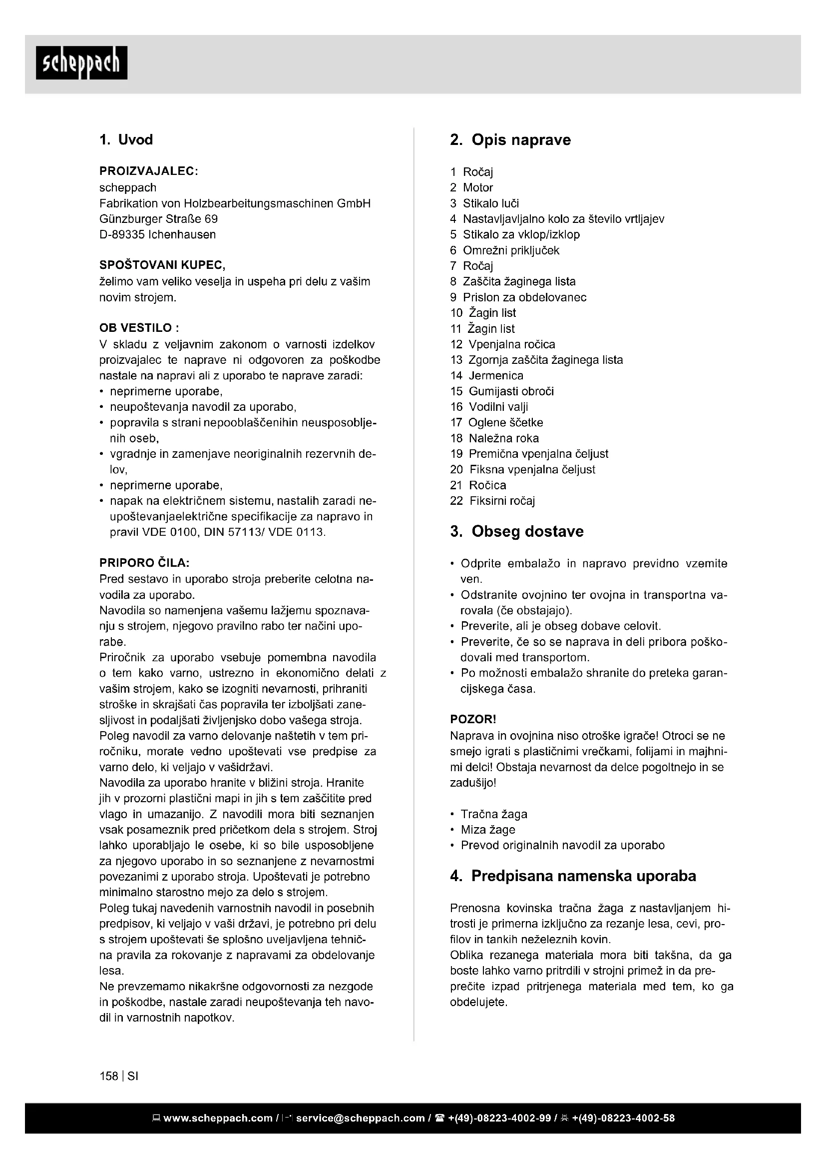 Prenosna kovinska tračna žaga z nastavljanjem hi- trosti je primerna izključno za rezanje lesa, cevi, pro- lov in tankih neželeznih kovin. Oblika rezanega materiala mora biti takšna, da ga boste lahko varno pritrdili v strojni primež in da pre- prečite izpad pritrjenega materiala med tem, ko ga obdelujete. www.scheppach.com / service@scheppach.com / +(49)-08223-4002-99 / +(49)-08223-4002-58
