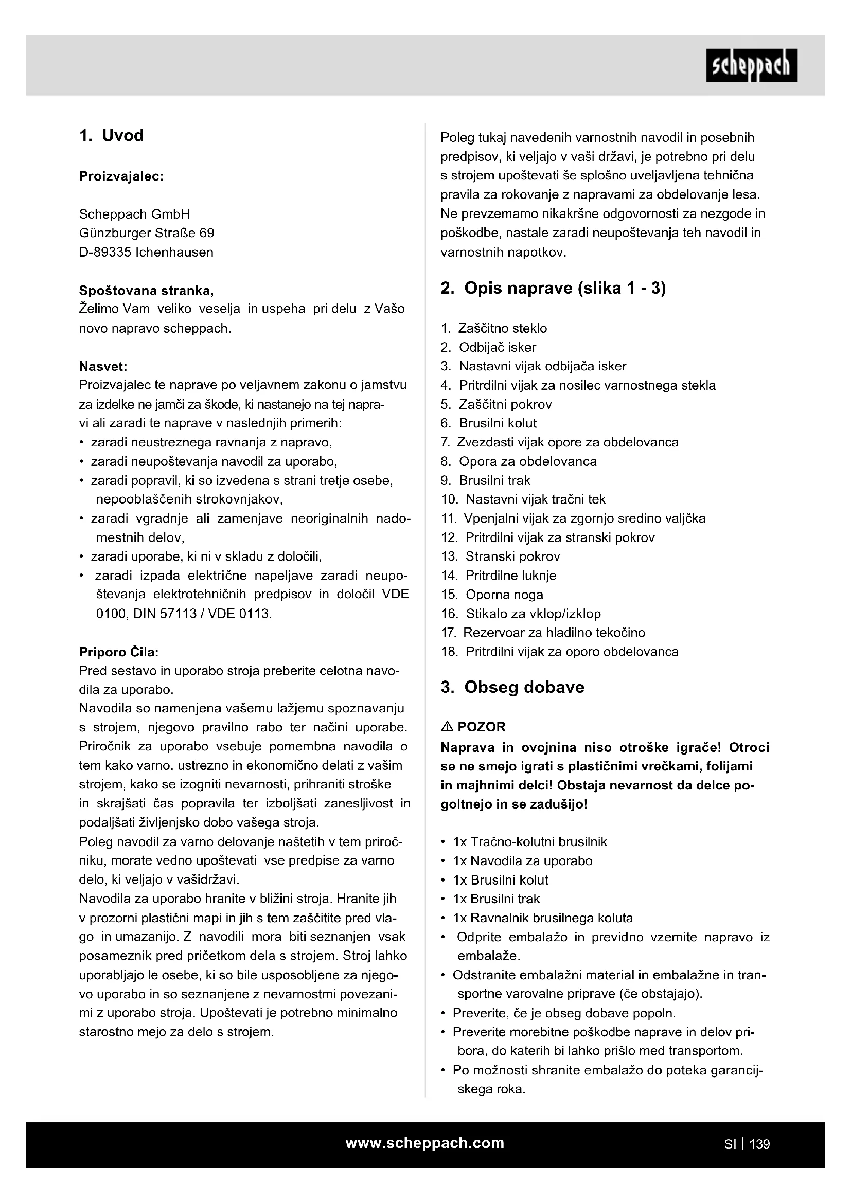 - zaradi izpada električne napeljave zaradi neupo- števanja elektrotehničnih predpisov in določil VDE 0100, DIN 57113 / VDE 0113. Priporo Čila: Pred sestavo in uporabo stroja preberite celotna navo- dila za uporabo. Navodila so namenjena vašemu lažjemu spoznavanju s strojem, njegovo pravilno rabo ter načini uporabe. Priročnik za uporabo vsebuje pomembna navodila o tem kako varno, ustrezno in ekonomično delati z vašim strojem, kako se izogniti nevarnosti, prihraniti stroške in skrajšati čas popravila ter izboljšati zanesljivost in podaljšati življenjsko dobo vašega stroja. Poleg navodil za varno delovanje naštetih v tem priroč- niku, morate vedno upoštevati vse predpise za varno delo, ki veljajo v vašidržavi. Navodila za uporabo hranite v bližini stroja. Hranite jih v prozorni plastični mapi in jih s tem zaščitite pred vla- go in umazanijo. Z navodili mora biti seznanjen vsak posameznik pred pričetkom dela s strojem. Stroj lahko uporabljajo le osebe, ki so bile usposobljene za njego- vo uporabo in so seznanjene z nevarnostmi povezani- mi z uporabo stroja. Upoštevati je potrebno minimalno starostno mejo za delo s strojem.www.scheppach.com