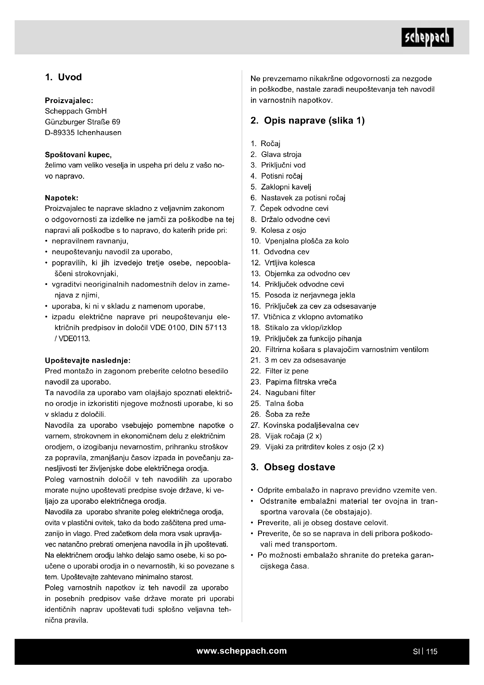 Proizvajalec: Scheppach GmbH Günzburger Straße 69 D-89335 Ichenhausen Spoštovani kupec, želimo vam veliko veselja in uspeha pri delu z vašo no- vo napravo. Napotek: Proizvajalec te naprave skladno z veljavnim zakonom o odgovornosti za izdelke ne jamči za poškodbe na tej napravi ali poškodbe s to napravo, do katerih pride pri: