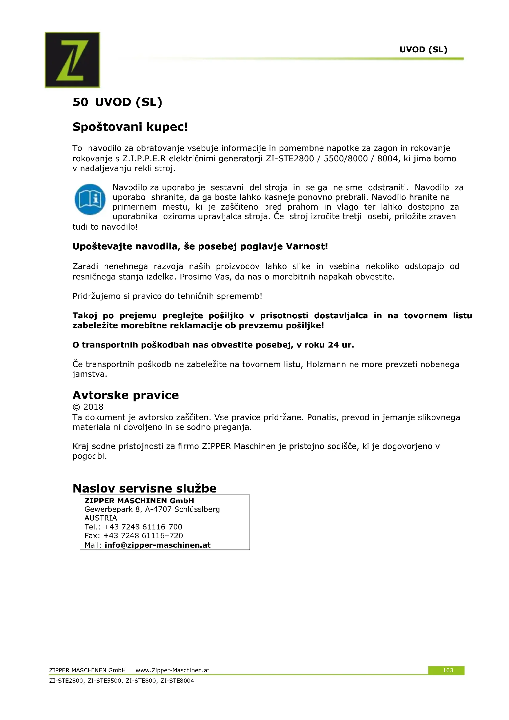 50 UVOD (SL) Spoštovani kupec! To navodilo za obratovanje vsebuje informacije in pomembne napotke za zagon in rokovanje rokovanje s Z.I.P.P.E.R električnimi generatorji ZI-STE2800 / 5500/8000 / 8004, ki jima bomo v nadaljevanju rekli stroj. Navodilo za uporabo je sestavni del stroja in se ga ne sme odstraniti. Navodilo za uporabo shranite, da ga boste lahko kasneje ponovno prebrali. Navodilo hranite na primernem mestu, ki je zaščiteno pred prahom in vlago ter lahko dostopno za uporabnika oziroma upravljalca stroja. Če stroj izročite tretji osebi, priložite zraven tudi to navodilo! Upoštevajte navodila, še posebej poglavje Varnost! Zaradi nenehnega razvoja naših proizvodov lahko slike in vsebina nekoliko odstopajo od resničnega stanja izdelka. Prosimo Vas, da nas o morebitnih napakah obvestite. Pridržujemo si pravico do tehničnih sprememb! Takoj po prejemu preglejte pošiljko v prisotnosti dostavljalca in na tovornem listu zabeležite morebitne reklamacije ob prevzemu pošiljke! O transportnih poškodbah nas obvestite posebej, v roku 24 ur. Če transportnih poškodb ne zabeležite na tovornem listu, Holzmann ne more prevzeti nobenega jamstva. Avtorske pravice © 2018 Ta dokument je avtorsko zaščiten. Vse pravice pridržane. Ponatis, prevod in jemanje slikovnega materiala ni dovoljeno in se sodno preganja. Kraj sodne pristojnosti za firmo ZIPPER Maschinen je pristojno sodišče, ki je dogovorjeno v pogodbi.