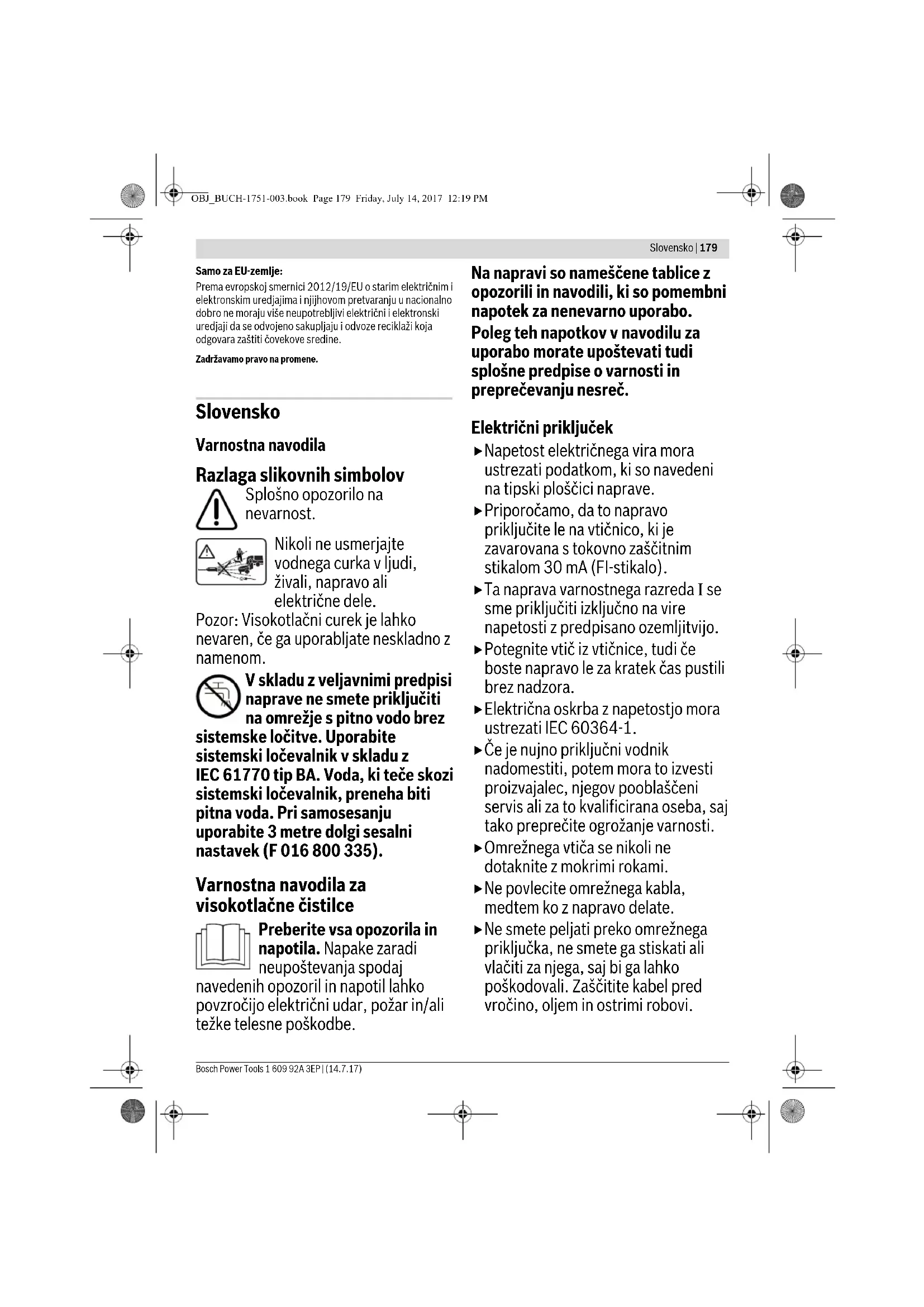 Impendanca omrežja Teža po EPTA-Procedure 01:2014 kg 16,5 Navedbe veljajo za nazivne napetosti [U] 230 V. Pri drugih napetostih in državno specifičnih izvedbah lahko te navedbe variirajo.Vklopi električnega orodja imajo za posledico kratkotrajne padce napetosti. Pri neugodnih pogojih v omrežju se lahko pojavijo motnje v delovanju drugih naprav. Pri omrežnih impendancah, ki znašajo manj kot 0,358 Ohm, motenj ni pričakovati. OBJ_BUCH-1751-003.book Page 182 Friday, July 14, 2017 12:19 PM Ω 0,358Slovensko | 183 Bosch Power Tools 1 609 92A 3EP | (14.7.17) Podatki o hrupu/vibracijah Merilne vrednosti hrupa izračunane v skladu z EN 60335-2-79. Z A-ocenjeni nivo hrupa naprave znaša običajno: nivo hrupa 81,8 dB(A); izmerjena moč hrupa 90 dB(A). Negotovost K =3 dB. Nosite zaščito sluha! Skupne vrednosti vibracij a
