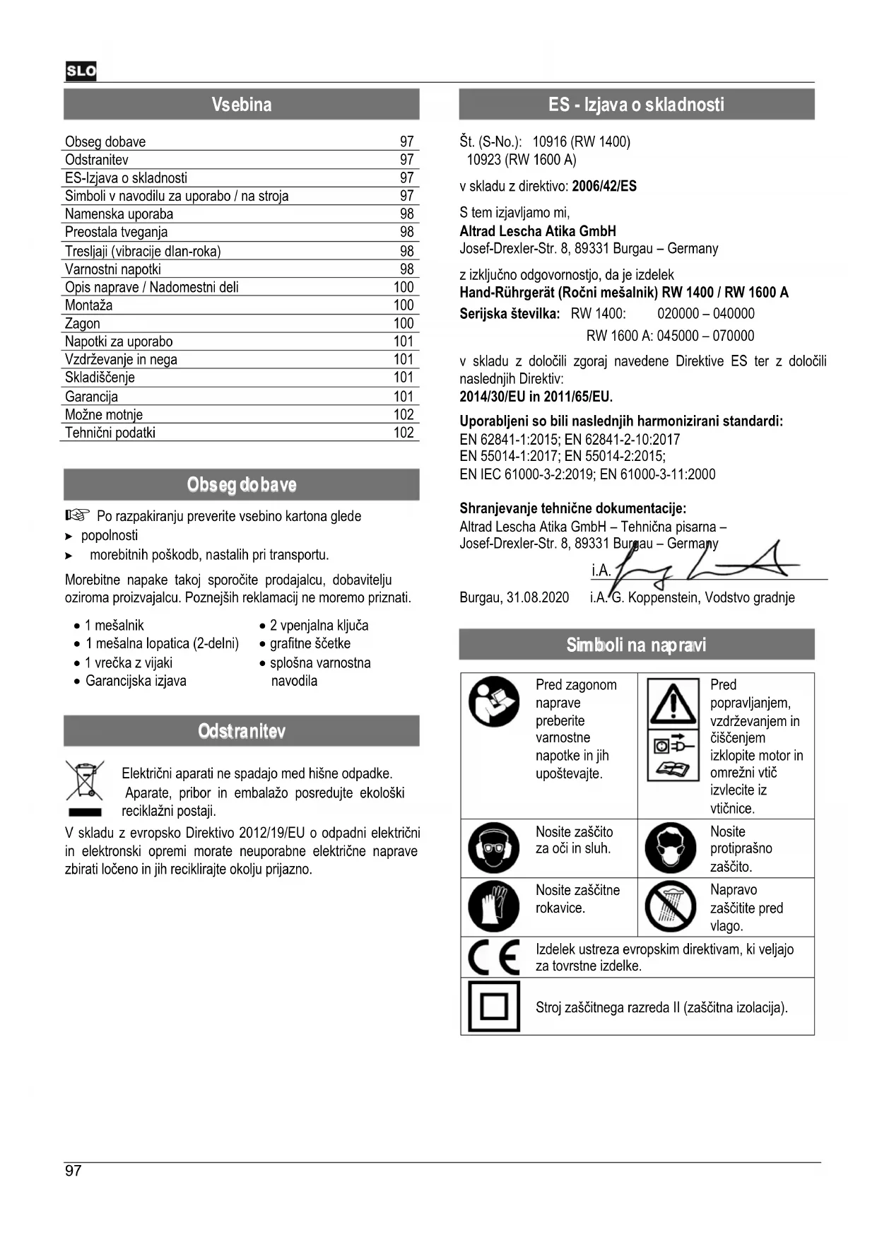 Vibracija dlan-roka a vnw = max 3,2 m/s²; Merilna nenatančnost: K = 1,5 m/s² Opozorilo: Dejanska obstoječa vrednost emisij vibracij med uporabo stroja lahko odstopa od navedene v navodilih za uporabo oz. tiste, ki jo je navedel proizvajalec. To lahko povzročijo naslednji dejavniki, ki jih morate upoštevati pred vsako uporabo in med njo: - pravilna uporaba stroja - pravilen način rezanja oz. obdelave materiala - stanje, v katerem je stroj - ali je mešalna lopatica v dobrem stanju oz. ali je nameščena pravilna mešalna metlica - so držaji in, če obstajajo, vibracijski ročaji montirajo in čvrsto ob ohišju stroja Če imate neprijeten občutek ali opazite obarvanje kože na rokah med uporabo stroja, takoj prenehajte z delom. Med delom si vzemite dovolj odmorov. Če si ne vzamete dovolj odmorov med delom, lahko pride do sindroma vibracije dlan- roka. Ocenite stopnjo obremenitve glede na delo oz. uporabo stroja in temu primerno načrtujte odmore. Na tak način lahko bistveno zmanjšate stopnjo obremenitve v celotnem delovnem času. Zmanjšajte tveganje, ki ste mu izpostavljeni med tresljaji. Stroj negujte v skladu z navodili v navodilih za uporabo. Stroja ne uporabljajte pri temperaturah 10 C ali manj. Izdelajte delovno načrt, s katerim boste obremenitev zaradi tresljajev omejili.