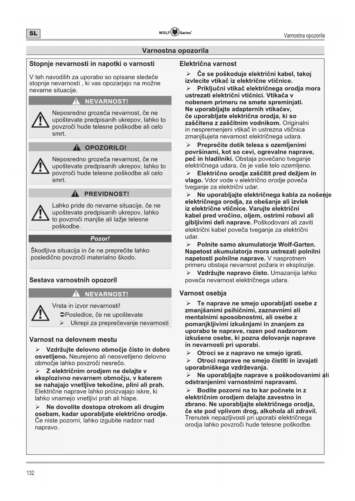 Varnostna opozorila Stopnje nevarnosti in napotki o varnosti V teh navodilih za uporabo so opisane sledeče stopnje nevarnosti , ki vas opozarjajo na možne nevarne situacije. NEVARNOST! Neposredno grozeča nevarnost, če ne upoštevate predpisanih ukrepov, lahko to povzroči hude telesne poškodbe ali celo smrt. OPOZORILO! Neposredno grozeča nevarnost, če ne upoštevate predpisanih ukrepov, lahko to povzroči hude telesne poškodbe ali celo smrt. PREVIDNOST! Lahko pride do nevarne situacije, če ne upoštevate predpisanih ukrepov, lahko to povzroči manjše ali lažje telesne poškodbe. Pozor! Škodljiva situacija in če ne preprečite lahko posledično povzroči materialno škodo. Sestava varnostnih opozoril NEVARNOST! Vrsta in izvor nevarnosti! ÂPosledice, če ne upoštevate ¾ Ukrepi za preprečevanje nevarnosti Varnost na delovnem mestu ¾ Vzdržujte delovno območje čisto in dobro osvetljeno. Neurejeno ali neosvetljeno delovno območje lahko povzroči nesrečo. ¾ Z električnim orodjem ne delajte v eksplozivno nevarnem območju, v katerem se nahajajo vnetljive tekočine, plini ali prah. Električne naprave lahko proizvajajo iskre, ki lahko vnamejo vnetljivi prah ali hlape. ¾ Ne dovolite dostopa otrokom ali drugim osebam, kadar uporabljate električno orodje. Če niste pozorni, lahko izgubite nadzor nad napravo. Električna varnost ¾ Če se poškoduje električni kabel, takoj izvlecite vtikač iz električne vtičnice. ¾ Priključni vtikač električnega orodja mora ustrezati električni vtičnici. Vtikača v nobenem primeru ne smete spreminjati. Ne uporabljajte adapternih vtikačev, če uporabljate električna orodja, ki so zaščitena z zaščitnim vodnikom. Originalni in nespremenjeni vtikač in ustrezna vtičnica zmanjšujeta nevarnost električnega udara. ¾ Preprečite dotik telesa s ozemljenimi površinami, kot so cevi, ogrevalne naprave, peč in hladilniki. Obstaja povečano tveganje električnega udara, če je vaše telo ozemljeno. ¾ Električno orodje zaščitit pred dežjem in vlago. Vdor vode v električno orodje poveča tveganje za električni udar. ¾ Ne uporabljajte električnega kabla za nošenje električnega orodja, za obešanje ali izvlek iz električne vtičnice. Varujte električni kabel pred vročino, oljem, ostrimi robovi ali gibljivimi deli naprave. Poškodovani ali zaviti električni kabel poveča tveganje za električni udar. ¾ Polnite samo akumulatorje Wolf-Garten. Napetost akumulatorja mora ustrezati polnilni napetosti polnilne naprave. V nasprotnem primeru obstaja nevarnost požara in eksplozije. ¾ Vzdržujte napravo čisto. Umazanija lahko poveča nevarnost električnega udara. Varnost osebja ¾ Te naprave ne smejo uporabljati osebe z zmanjšanimi psihičnimi, zaznavnimi ali mentalnimi sposobnostmi, ali osebe z pomanjkljivimi izkušnjami in znanjem za uporabo te naprave, razen pod nadzorom izkušene osebe, ki pozna delovanje naprave in nevarnosti pri uporabi. ¾ Otroci se z napravo ne smejo igrati. ¾ Otroci naprave ne smejo čistiti in izvajati uporabniškega vzdrževanja. ¾ Ne uporabljajte naprave s poškodovanimi ali odstranjenimi varnostnimi napravami. ¾ Bodite pozorni na to kar počnete in z električnim orodjem delajte zavestno in zbrano. Ne uporabljajte električnega orodja, če ste pod vplivom drog, alkohola ali zdravil. Trenutek nepazljivosti pri uporabi električnega orodja lahko povzroči hude telesne poškodbe.Varnostna opozorila