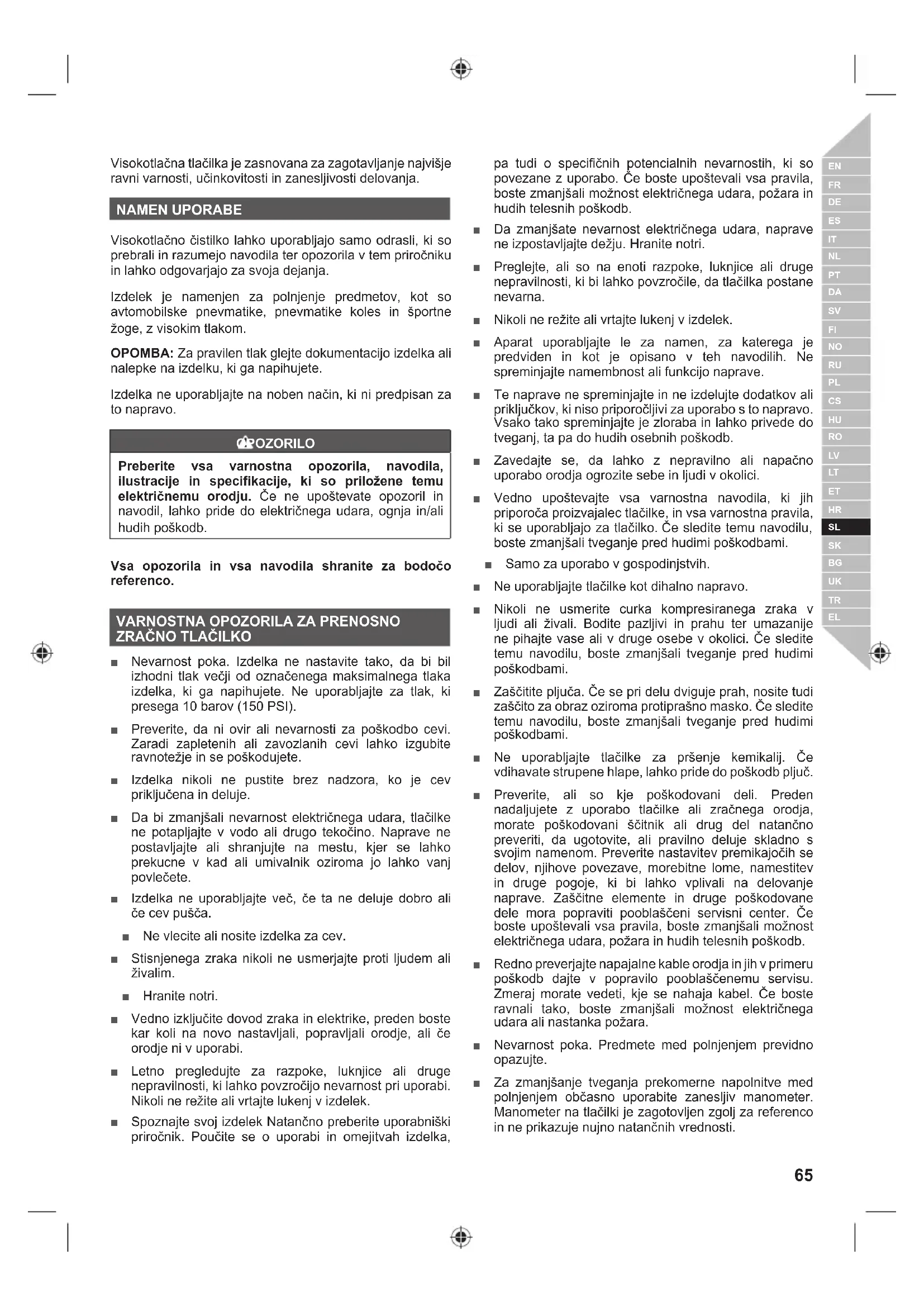 ■ Nevarnost poka. Izdelka ne nastavite tako, da bi bil izhodni tlak večji od označenega maksimalnega tlaka izdelka, ki ga napihujete. Ne uporabljajte za tlak, ki presega 10 barov (150 PSI). ■ Preverite, da ni ovir ali nevarnosti za poškodbo cevi. Zaradi zapletenih ali zavozlanih cevi lahko izgubite ravnotežje in se poškodujete. ■ Izdelka nikoli ne pustite brez nadzora, ko je cev priključena in deluje. ■ Da bi zmanjšali nevarnost električnega udara, tlačilke ne potapljajte v vodo ali drugo tekočino. Naprave ne postavljajte ali shranjujte na mestu, kjer se lahko prekucne v kad ali umivalnik oziroma jo lahko vanj povlečete. ■ Izdelka ne uporabljajte več, če ta ne deluje dobro ali če cev pušča. ■ Ne vlecite ali nosite izdelka za cev. ■ Stisnjenega zraka nikoli ne usmerjajte proti ljudem ali živalim. ■ Hranite notri. ■ Vedno izključite dovod zraka in elektrike, preden boste kar koli na novo nastavljali, popravljali orodje, ali če orodje ni v uporabi. ■ Letno pregledujte za razpoke, luknjice ali druge nepravilnosti, ki lahko povzročijo nevarnost pri uporabi. Nikoli ne režite ali vrtajte lukenj v izdelek. ■ Spoznajte svoj izdelek Natančno preberite uporabniški priročnik. Poučite se o uporabi in omejitvah izdelka, pa tudi o specifičnih potencialnih nevarnostih, ki so povezane z uporabo. Če boste upoštevali vsa pravila, boste zmanjšali možnost električnega udara, požara in hudih telesnih poškodb. ■ Da zmanjšate nevarnost električnega udara, naprave ne izpostavljajte dežju. Hranite notri. ■ Preglejte, ali so na enoti razpoke, luknjice ali druge nepravilnosti, ki bi lahko povzročile, da tlačilka postane nevarna. ■ Nikoli ne režite ali vrtajte lukenj v izdelek. ■ Aparat uporabljajte le za namen, za katerega je predviden in kot je opisano v teh navodilih. Ne spreminjajte namembnost ali funkcijo naprave. ■ Te naprave ne spreminjajte in ne izdelujte dodatkov ali priključkov, ki niso priporočljivi za uporabo s to napravo. Vsako tako spreminjajte je zloraba in lahko privede do tveganj, ta pa do hudih osebnih poškodb. ■ Zavedajte se, da lahko z nepravilno ali napačno uporabo orodja ogrozite sebe in ljudi v okolici. ■ Vedno upoštevajte vsa varnostna navodila, ki jih priporoča proizvajalec tlačilke, in vsa varnostna pravila, ki se uporabljajo za tlačilko. Če sledite temu navodilu, boste zmanjšali tveganje pred hudimi poškodbami. ■ Samo za uporabo v gospodinjstvih. ■ Ne uporabljajte tlačilke kot dihalno napravo. ■ Nikoli ne usmerite curka kompresiranega zraka v ljudi ali živali. Bodite pazljivi in prahu ter umazanije ne pihajte vase ali v druge osebe v okolici. Če sledite temu navodilu, boste zmanjšali tveganje pred hudimi poškodbami. ■ Zaščitite pljuča. Če se pri delu dviguje prah, nosite tudi zaščito za obraz oziroma protiprašno masko. Če sledite temu navodilu, boste zmanjšali tveganje pred hudimi poškodbami. ■ Ne uporabljajte tlačilke za pršenje kemikalij. Če vdihavate strupene hlape, lahko pride do poškodb pljuč. ■ Preverite, ali so kje poškodovani deli. Preden nadaljujete z uporabo tlačilke ali zračnega orodja, morate poškodovani ščitnik ali drug del natančno preveriti, da ugotovite, ali pravilno deluje skladno s svojim namenom. Preverite nastavitev premikajočih se delov, njihove povezave, morebitne lome, namestitev in druge pogoje, ki bi lahko vplivali na delovanje naprave. Zaščitne elemente in druge poškodovane dele mora popraviti pooblaščeni servisni center. Če boste upoštevali vsa pravila, boste zmanjšali možnost električnega udara, požara in hudih telesnih poškodb. ■ Redno preverjajte napajalne kable orodja in jih v primeru poškodb dajte v popravilo pooblaščenemu servisu. Zmeraj morate vedeti, kje se nahaja kabel. Če boste ravnali tako, boste zmanjšali možnost električnega udara ali nastanka požara. ■ Nevarnost poka. Predmete med polnjenjem previdno opazujte. ■ Za zmanjšanje tveganja prekomerne napolnitve med polnjenjem občasno uporabite zanesljiv manometer. Manometer na tlačilki je zagotovljen zgolj za referenco in ne prikazuje nujno natančnih vrednosti.66 | Slovensko ■ Črpalka naj se hladi pet (5) minut po vsakih petih (5) minutah neprekinjene uporabe. Med delovanjem nikoli ne ovirajte polnilnih ali odvajalnih šob. ■ Shranite ta navodila. Redno se sklicujte nanje in jih uporabljajte pri poučevanju drugih morebitnih uporabnikov tega orodja. Če napravo komu posodite, priložite zraven tudi ta navodila. ■ Temperatura okolja delovanja orodja je med 0 °C in 40 °C. ■ Temperatura okolja shranjevanja orodja je med 0 °C in 40 °C. ■ Priporočena temperatura okolja za polnilni sistem med polnjenjem je med 10 °C in 38 °C.