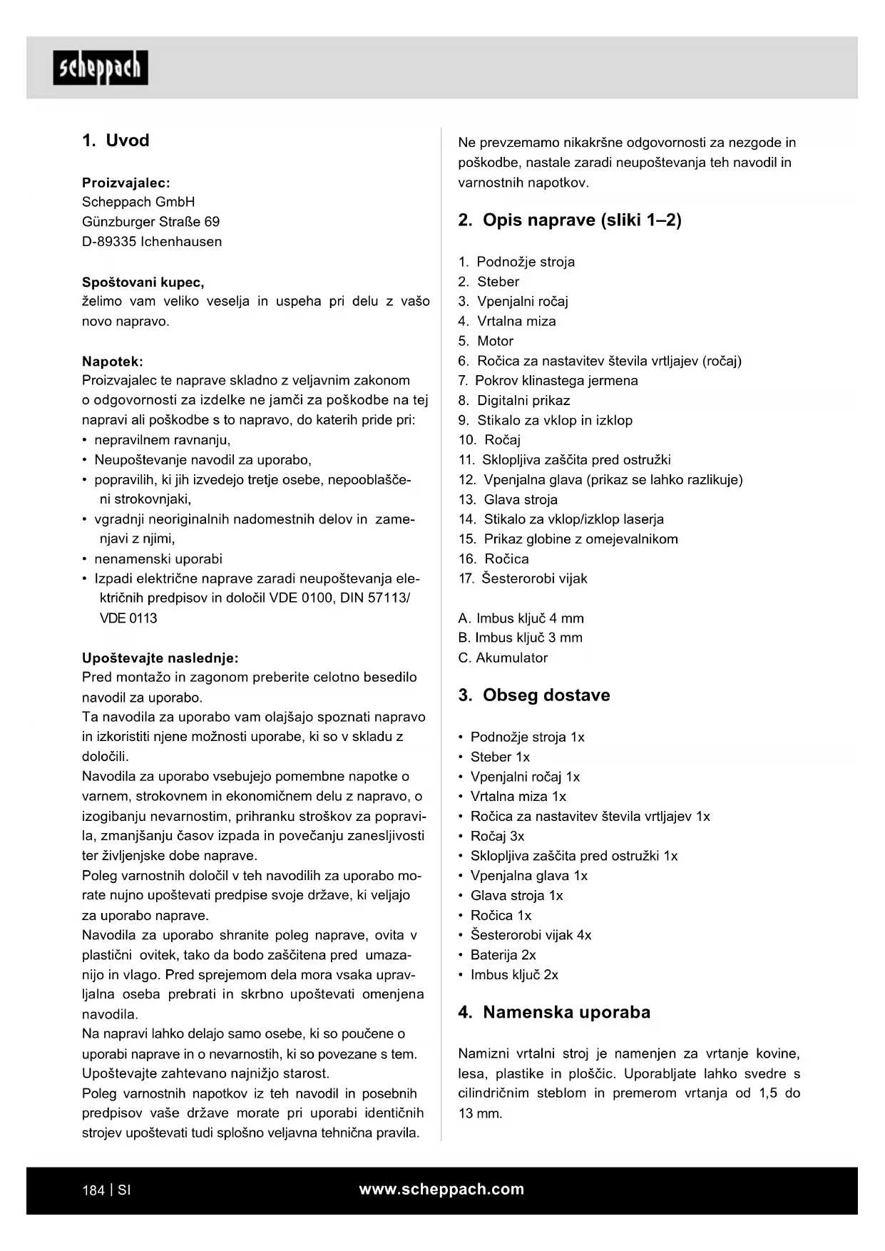 e) Skrbno negujte električna in vstavitvena orod- ja. Preverite, če gibljivi deli brezhibno delujejo in se ne zatikajo, če so deli zlomljeni ali tako poš- kodovani, da je delovanje električnega orodja omejeno. Pred uporabo električnega orodja je tre- ba popraviti poškodovane dele. Veliko nesreč se zgodi zaradi slabo vzdrževanih električnih orodij. f) Rezalna orodja morajo biti ostra in čista. Skrb- no negovana rezalna orodja z ostrimi rezalnimi robovi se manj zatikajo in jih je mogoče lažje voditi. g) Električno orodje, pribor, vložna orodja itd. uporabljajte v skladu s temi navodili. Pri tem upoštevajte delovne pogoje in opravilo, ki ga je tre- ba izvršiti. Uporaba električnega orodja v namene, za katere ni predvideno, lahko vodi do nevarnih situacij. h) Ročaji in prijemalne površine morajo biti suhe, čiste in brez olja in masti. Spolzki ročaji in spolz- ke prijemalne površine ne omogočajo varnega upravljanja in nadzor električnega orodja v ne- predvidljivih situacijah. Servis a) Vaše električno orodje sme popravljati samo kvalicirano strokovno osebje in samo z origi- nalnimi nadomestnimi deli. Tako je zagotovlje- no, da električno orodje ostane varno. Varnostni napotki za vrtalnike a) Vrtalnik je treba zavarovati. Nepravilno pritrjen vrtalnik se lahko premika ali prevrne, kar lahko povzroči poškodbe. b) Obdelovanec je treba vpeti ali pritrditi na pod- lago za obdelovanec. Ne vrtajte obdelovancev, ki so premajhni za varno vpetje. Če obdelova- nec držite z roko, lahko pride do poškodb. c) Ne nosite rokavic. Rokavice se lahko zataknejo za vrteče dele ali vrtalne ostružke in povzročijo poškodbe. d) Kadar električno orodje deluje, rok ne približu- jte območju vrtanja. Stik z vrtečimi deli ali vrtal- nimi ostružki lahko povzroči poškodbe. e) Preden vrtalnik primaknete k obdelovancu, se mora vrtalno orodje vrteti. V nasprotnem prime- ru se lahko vrtalno orodje zatakne v obdelovancu in s tem povzroči nepričakovano premikanje obde- lovanca ter poškodbe. Če imate pri nošenju električnega orodja prst na stikalu ali električno orodje vklopljeno priključite na tokovno napajanje, lahko to privede do nesreč. d) Preden boste vklopili električno orodje, od- stranite orodja za nastavitev ali vijačni ključ. Orodje ali ključ, ki se nahaja v vrtečem se delu na- prave, lahko privede do telesnih poškodb. e) Izogibajte se nenaravni telesni drži. Pazite, da stojite varno in da vedno ohranjate ravnotežje. Tako lahko električno orodje v nepričakovanih situ- acijah bolje kontrolirate. f) Nosite primerna oblačila. Ne nosite širokih oblačil ali nakita. Las, oblačil in rokavic ne približujte premikajočim se delom. Premikajoči se deli lahko zagrabijo ohlapna oblačila, nakit ali dolge lase. g) Če lahko montirate naprave za odsesavanje in lovljenje prahu, se prepričajte, da so te priklju- čene in se pravilno uporabljajo. Uporaba napra- ve za odsesavanje prahu lahko zmanjša nevarnost zaradi prahu. h) Ne bodite prepričani, da se vam nič ne more zgoditi in nikar ne prezrite varnostnih pravil za električna orodja, tudi če ste po večkratni upo- rabi električnega orodja popolnoma samoza- vestni pri njegovi uporabi. Nepazljiva uporaba lahko v delčku sekunde privede do hudih poškodb. Uporaba električnega orodja in ravnanje z njim a) Ne preobremenite naprave. Za svoje delo upora- bite temu namenjeno električno orodje. Z ustreznim električnim orodjem lahko v podanem območju moči delate boljše in varneje. b) Ne uporabljajte električnega orodja, ki ima okvarjeno stikalo. Električno orodje, ki ga ni več mogoče vklopiti ali izklopiti, je nevarno in ga je treba popraviti. c) Izvlecite vtič iz vtičnice in/ali odstranite sne- mljivo akumulatorsko baterijo, preden boste nastavili napravo, zamenjali dodatno opremo ali shranili električno orodje. S tem previdno- stnim ukrepom preprečite nenamerni zagon elek- tričnega orodja. d) Nerabljena električna orodja hranite izven dosega otrok. Osebam, ki niso seznanjene z napravo ali niso prebrali teh navodil, ne pustite uporabljati električnega orodja. Električna orodja so nevarna, če jih uporabljajo neizkušene osebe.www.scheppach.com