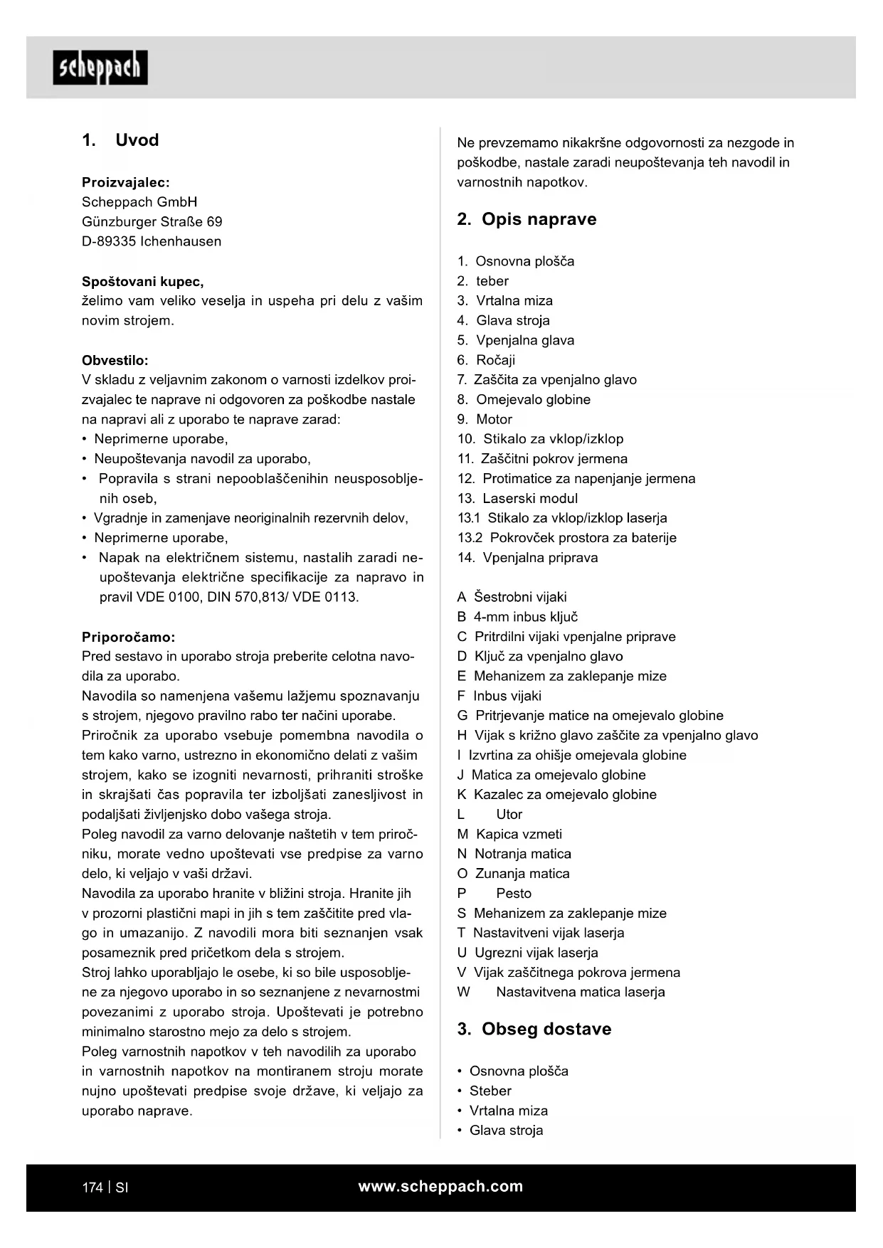 - Napak na električnem sistemu, nastalih zaradi ne- upoštevanja električne specikacije za napravo in pravil VDE 0100, DIN 570,813/ VDE 0113. Priporočamo: Pred sestavo in uporabo stroja preberite celotna navo- dila za uporabo. Navodila so namenjena vašemu lažjemu spoznavanju s strojem, njegovo pravilno rabo ter načini uporabe. Priročnik za uporabo vsebuje pomembna navodila o tem kako varno, ustrezno in ekonomično delati z vašim strojem, kako se izogniti nevarnosti, prihraniti stroške in skrajšati čas popravila ter izboljšati zanesljivost in podaljšati življenjsko dobo vašega stroja. Poleg navodil za varno delovanje naštetih v tem priroč- niku, morate vedno upoštevati vse predpise za varno delo, ki veljajo v vaši državi. Navodila za uporabo hranite v bližini stroja. Hranite jih v prozorni plastični mapi in jih s tem zaščitite pred vla- go in umazanijo. Z navodili mora biti seznanjen vsak posameznik pred pričetkom dela s strojem. Stroj lahko uporabljajo le osebe, ki so bile usposoblje- ne za njegovo uporabo in so seznanjene z nevarnostmi povezanimi z uporabo stroja. Upoštevati je potrebno minimalno starostno mejo za delo s strojem. Poleg varnostnih napotkov v teh navodilih za uporabo in varnostnih napotkov na montiranem stroju morate nujno upoštevati predpise svoje države, ki veljajo za uporabo naprave.www.scheppach.com