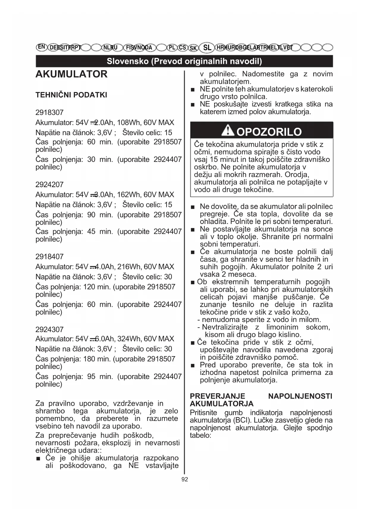 Akumulator: 54V 6.0Ah, 324Wh, 60V MAX Napätie na článok: 3,6V ; Število celic: 30 Čas polnjenja: 180 min. (uporabite 2918507 polnilec) Čas polnjenja: 95 min. (uporabite 2924407 polnilec) Za pravilno uporabo, vzdrževanje in shrambo tega akumulatorja, je zelo pomembno, da preberete in razumete vsebino teh navodil za uporabo. Za preprečevanje hudih poškodb, nevarnosti požara, eksplozij in nevarnosti električnega udara:: ■ Če je ohišje akumulatorja razpokano ali poškodovano, ga NE vstavljajte v polnilec. Nadomestite ga z novim akumulatorjem. ■ NE polnite teh akumulatorjev s katerokoli drugo vrsto polnilca. ■ NE poskušajte izvesti kratkega stika na katerem izmed polov akumulatorja. OPOZORILO Če tekočina akumulatorja pride v stik z očmi, nemudoma spirajte s čisto vodo vsaj 15 minut in takoj poiščite zdravniško oskrbo. Ne polnite akumulatorja v dežju ali mokrih razmerah. Orodja, akumulatorja ali polnilca ne potapljajte v vodo ali druge tekočine. ■ Ne dovolite, da se akumulator ali polnilec pregreje. Če sta topla, dovolite da se ohladita. Polnite le pri sobni temperaturi. ■ Ne postavljajte akumulatorja na sonce ali v toplo okolje. Shranite pri normalni sobni temperaturi. ■ Če akumulatorja ne boste polnili dalj časa, ga shranite v senci ter hladnih in suhih pogojih. Akumulator polnite 2 uri vsaka 2 meseca. ■ Ob ekstremnih temperaturnih pogojih ali uporabi, se lahko pri akumulatorskih celicah pojavi manjše puščanje. Če zunanje tesnilo ne deluje in razlita tekočine pride v stik z vašo kožo, - nemudoma sperite z vodo in milom. - Nevtralizirajte z limoninim sokom, kisom ali drugo blago kislino. ■ Če tekočina pride v stik z očmi, upoštevajte navodila navedena zgoraj in poiščite zdravniško pomoč. ■ Pred uporabo preverite, če sta tok in izhodna napetost polnilca primerna za polnjenje akumulatorja. PREVERJANJE NAPOLNJENOSTI AKUMULATORJA Pritisnite gumb indikatorja napolnjenosti akumulatorja (BCI). Lučke zasvetijo glede na napolnjenost akumulatorja. Glejte spodnjo tabelo:Slovensko (Prevod originalnih navodil)
