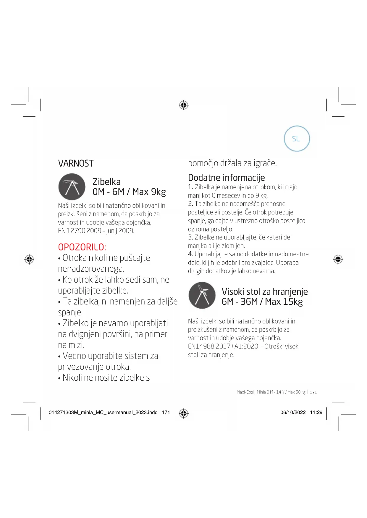 - Za pranje tkanine glejte navodila na etiketi. Okolje Kadar prenehate uporabljati izdelek, ga iz okoljevarstvenih razlogov odložite v ustreznih zbirnih centrih za posebne odpadke, skladno z lokalno zakonodajo. Vprašanja Obrnite se na vašega lokalnega prodajalca ali obiščite našo spletno stran. Pri tem imejte pri roki naslednje podatke: – Serijsko številko – Starost (višino) in težo otroka. Garancija Naša 24-mesečna garancija odraža naše zaupanje v visoko kakovost oblikovanja, inženiringa, proizvodnje in učinkovitost naših izdelkov. Zagotavljamo vam, da je izdelek v skladu s trenutno veljavnimi evropskimi varnostnimi zahtevami in standardi kakovosti, ki se uporabljajo za ta izdelek in