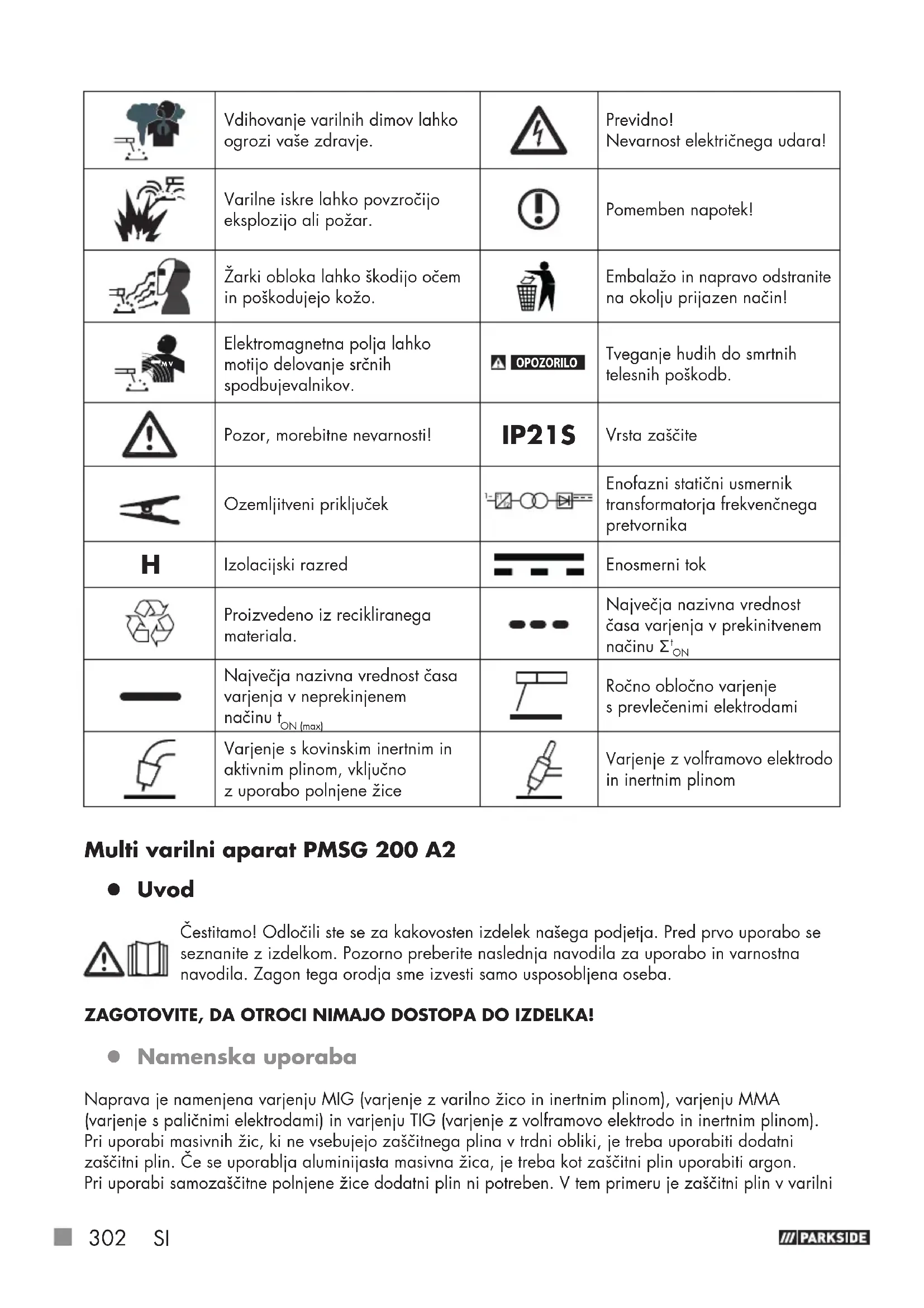 žici vsebovan v praškasti obliki in se zato vodi neposredno v oblok. Zaradi tega je naprava neobčutljiva na veter pri delu na prostem. Uporabljajte samo žične elektrode, ki so primerne za napravo. Ta varilni aparat je primeren za ročno obločno varjenje (varjenje MMA) jekla, nerjavečega jekla, jeklene pločevine in litega materiala z uporabo ustreznih oplaščenih elektrod. Upoštevajte podatke proi- zvajalca elektrod. Uporabljati se sme le elektrode, ki so primerne za ta aparat. Pri varjenju z volframovo elektrodo in inertnim plinom (TIG varjenje) morate poleg navodil za obratovanje in varnostnih navodil uporabljenega TIG-gorilnika upoštevati tudi navodila in varnostna navodila v teh navodilih za uporabo. Nepravilno ravnanje z izdelkom predstavlja tveganje za ljudi, živali in premoženje. Varilna maska se lahko uporablja samo z varilnimi zaščitnimi stekli ter namenskimi stekli, ki so ustrezno označena in se načeloma lahko uporabljajo samo za varjenje. Varilna maska ni primerna za lasersko varjenje! Izdelek uporabljajte samo, kot je opisano, in za navedena področja uporabe. Dobro shranite ta navodila za uporabo. Pri predaji tretji osebi izdelku priložite tudi celotno dokumentacijo. Vsaka uporaba, ki odstopa od predvidene, je prepovedana in morebiti nevarna. Škoda, ki nastane zaradi neupoštevanja navodil ali zlorabe, ni zajeta v kritju garancije in ni odgovornost proizvajalca. V primeru komercialne uporabe garancija preneha veljati. Namenska uporaba vključuje tudi upoštevanje varnostnih navodil in navodil za montažo ter delovnih navodil v navodilih za uporabo. Veljavne predpise o preprečevanju nesreč morate skrbno upoštevati. Naprave se ne sme uporabljati: v prostorih, ki niso zadosti prezračeni, v okolju, kjer obstaja nevarnost eksplozije, za odtaljevanje cevi, v bližini oseb s srčnim spodbujevalnikom in v bližini lahko vnetljivih snovi. Preostalo tveganje Tudi če pravilno upravljate napravo, ostajajo ostala tveganja. V zvezi z zasnovo in konstrukcijo tega Multi varilnega aparata se lahko pojavijo naslednje nevarnosti: poškodbe oči zaradi bleščanja, dotikanje vročih delov naprave ali obdelovanca (poškodbe zaradi opeklin), ob nestrokovni zaščiti nevarnost nesreč in požara zaradi letečih isker ali delcev žlindre, zdravju nevarne emisije dima in plinov, ob pomanjkanju zraka oz. nezadostnem odsesavanju v zaprtih prostorih. NAPOTEK: Zmanjšajte preostalo tveganje s skrbno in pravilno uporabo naprave ter upoštevanjem vseh navodil. z Obseg dobave 1 Multi varilni aparat PMSG 200 A2 1 varilna šoba 1,0mm (predhodno nameščena, le za masivno aluminijasto žico), oznaka: 1,0A 4 varilne šobe za jekleno/polnjeno žico (1x 0,6mm; 1x 0,8mm; 1x 0,9mm; 1x 1,0mm) Oznaka ustrezna premeru: 0,6; 0,8; 0,9; 1,0 1 kladivo za žlindro z žično krtačo 1 aluminijasta masivna žica 200g (predhodno nameščena) 1,0mm Ø, tip: ER5356 1 varilni vizir 1 držalo za elektrode MMA 1 navodila za uporabo 1 ozemljitveni priključek s kablom 1 gorilnik MIG z varilnim vodom 1 polnjena žica 200g 1,0mm Ø, tip: E71T-GS 5 paličnih elektrod (2x 1,6mm; 2x 2,0mm; 1x 2,5mm)304