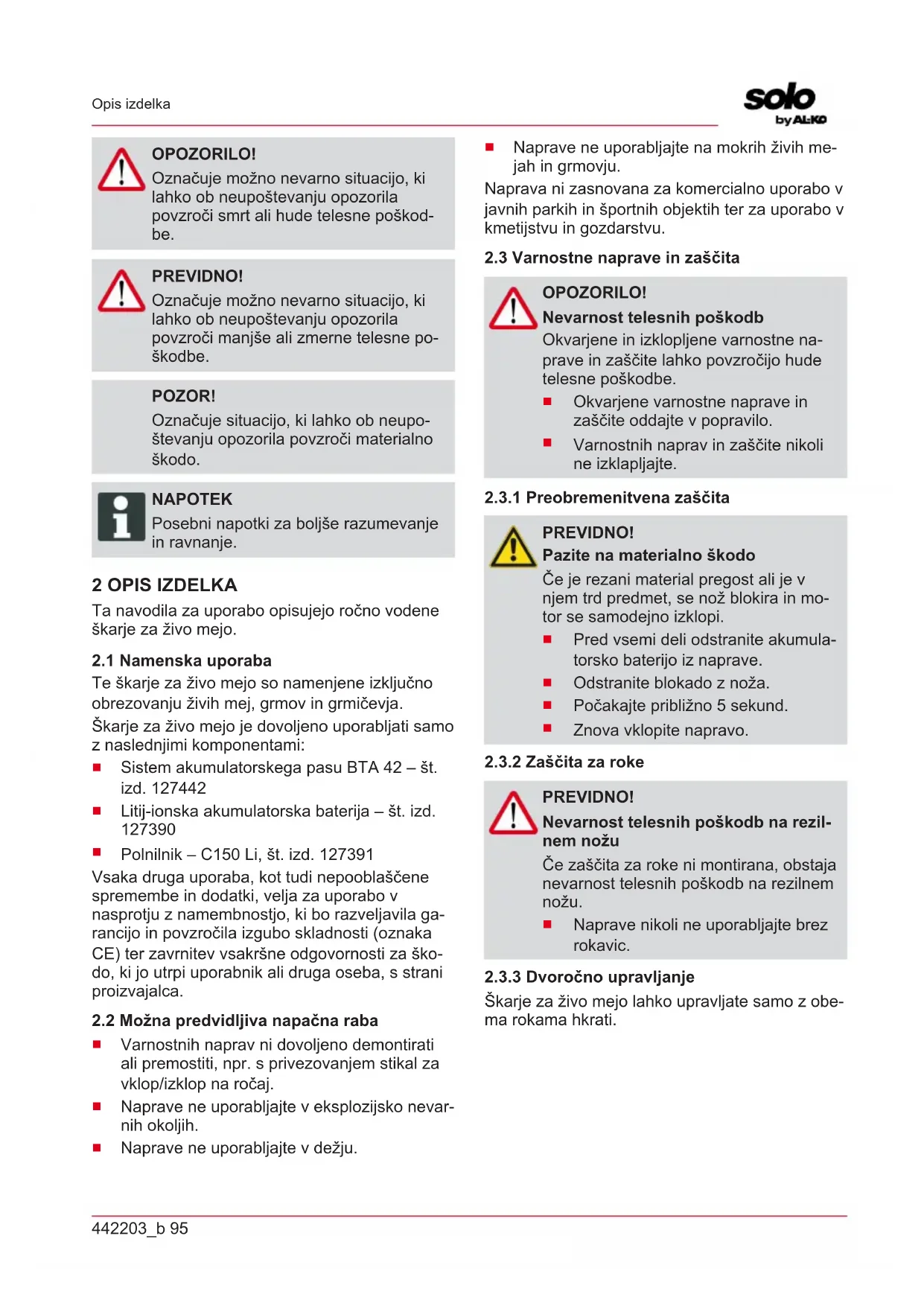 NEVARNOST! Označuje neposredno nevarno situacijo, ki bo ob neupoštevanju opozorila povzročila smrt ali hude telesne poškod- be.442203_b 95 Opis izdelka OPOZORILO! Označuje možno nevarno situacijo, ki lahko ob neupoštevanju opozorila povzroči smrt ali hude telesne poškod- be. PREVIDNO! Označuje možno nevarno situacijo, ki lahko ob neupoštevanju opozorila povzroči manjše ali zmerne telesne po- škodbe. POZOR! Označuje situacijo, ki lahko ob neupo- števanju opozorila povzroči materialno škodo. NAPOTEK Posebni napotki za boljše razumevanje in ravnanje. 2 OPIS IZDELKA Ta navodila za uporabo opisujejo ročno vodene škarje za živo mejo.