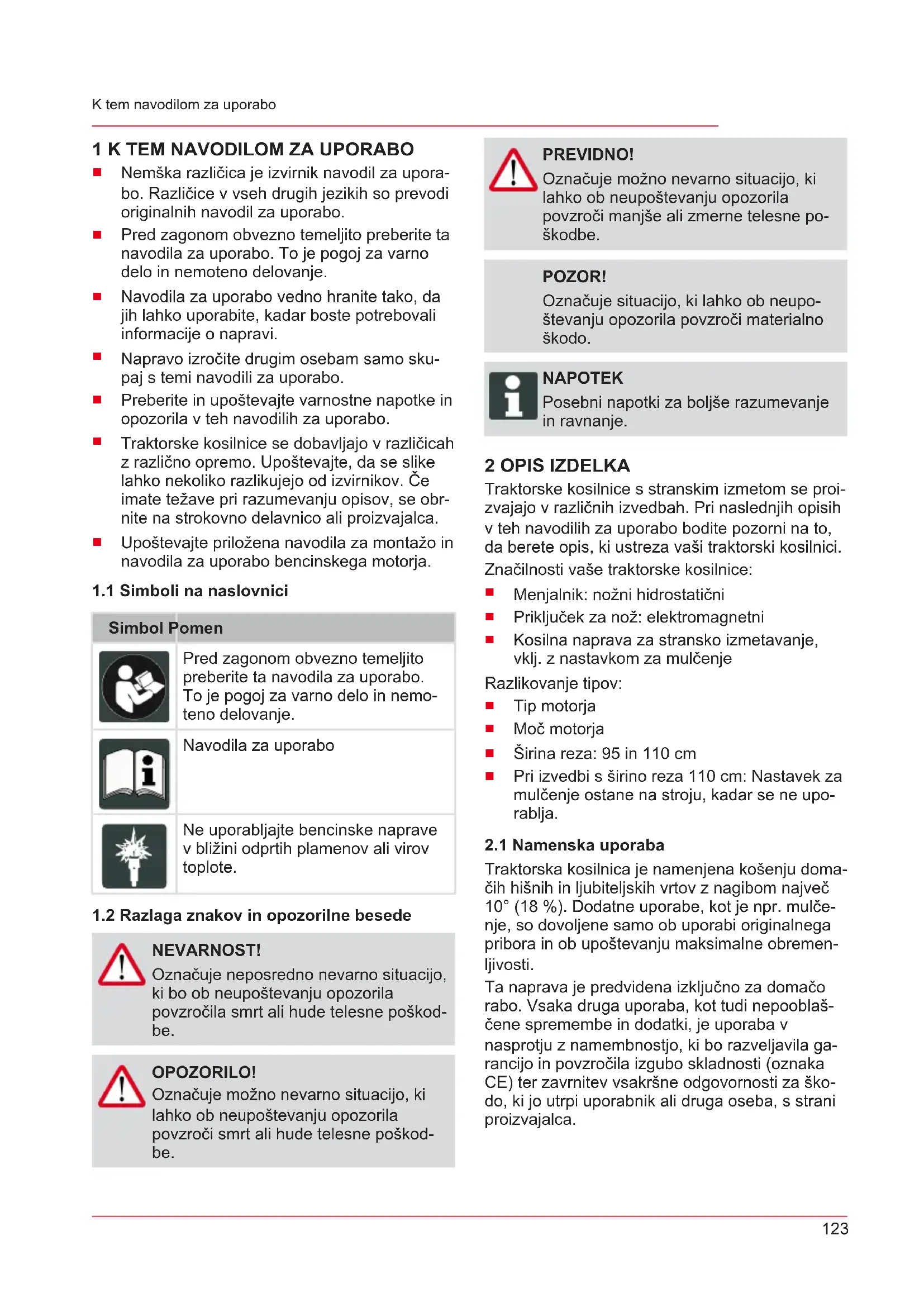NEVARNOST! Označuje neposredno nevarno situacijo, ki bo ob neupoštevanju opozorila povzročila smrt ali hude telesne poškod- be. OPOZORILO! Označuje možno nevarno situacijo, ki lahko ob neupoštevanju opozorila povzroči smrt ali hude telesne poškod- be. PREVIDNO! Označuje možno nevarno situacijo, ki lahko ob neupoštevanju opozorila povzroči manjše ali zmerne telesne po- škodbe. POZOR! Označuje situacijo, ki lahko ob neupo- števanju opozorila povzroči materialno škodo. NAPOTEK Posebni napotki za boljše razumevanje in ravnanje. 2 OPIS IZDELKA Traktorske kosilnice s stranskim izmetom se proi- zvajajo v različnih izvedbah. Pri naslednjih opisih v teh navodilih za uporabo bodite pozorni na to, da berete opis, ki ustreza vaši traktorski kosilnici. Značilnosti vaše traktorske kosilnice: