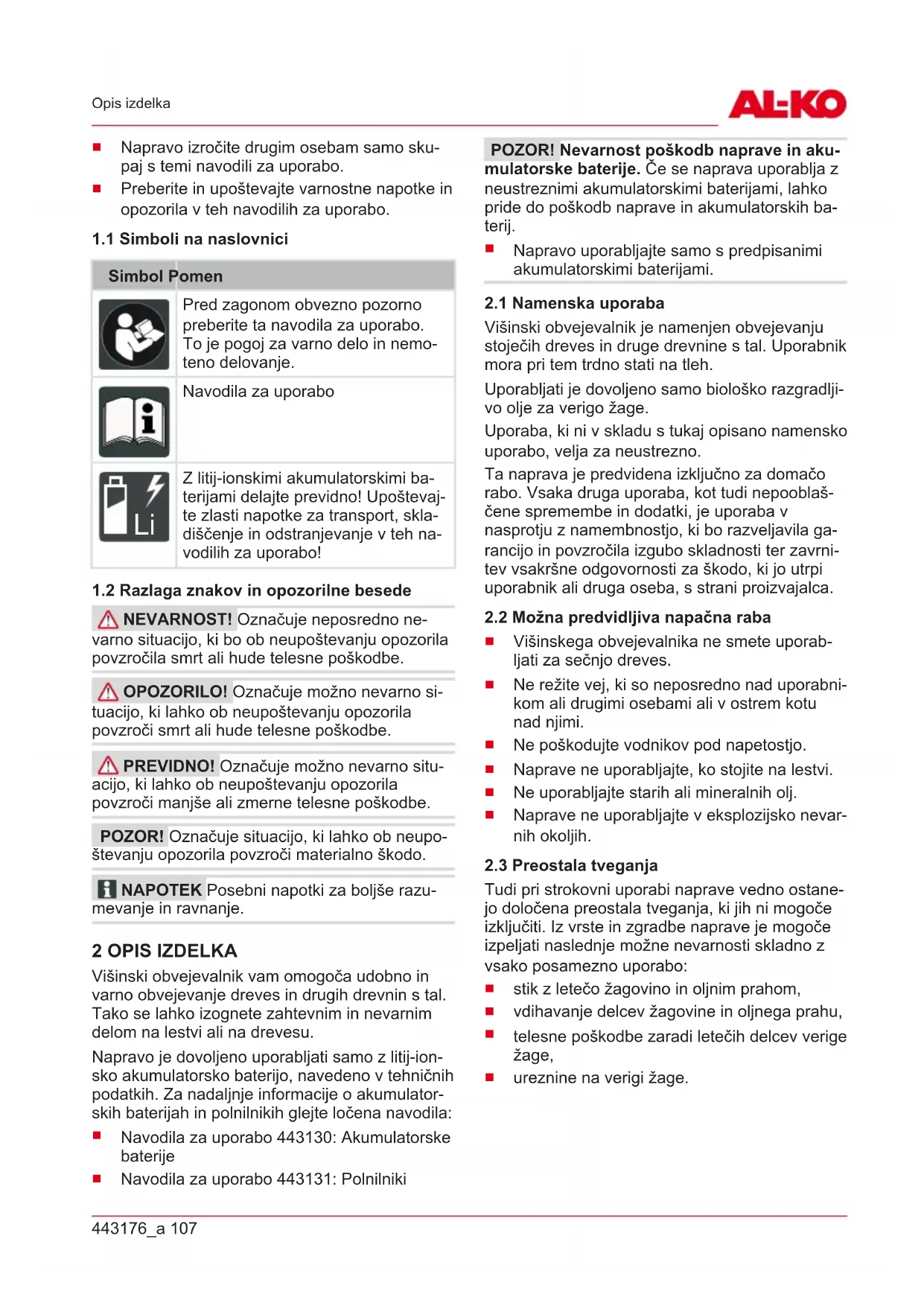 NEVARNOST! Označuje neposredno ne- varno situacijo, ki bo ob neupoštevanju opozorila povzročila smrt ali hude telesne poškodbe. OPOZORILO! Označuje možno nevarno si- tuacijo, ki lahko ob neupoštevanju opozorila povzroči smrt ali hude telesne poškodbe. PREVIDNO! Označuje možno nevarno situ- acijo, ki lahko ob neupoštevanju opozorila povzroči manjše ali zmerne telesne poškodbe. POZOR! Označuje situacijo, ki lahko ob neupo- števanju opozorila povzroči materialno škodo. NAPOTEK Posebni napotki za boljše razu- mevanje in ravnanje. 2 OPIS IZDELKA Višinski obvejevalnik vam omogoča udobno in varno obvejevanje dreves in drugih drevnin s tal. Tako se lahko izognete zahtevnim in nevarnim delom na lestvi ali na drevesu. Napravo je dovoljeno uporabljati samo z litij-ion- sko akumulatorsko baterijo, navedeno v tehničnih podatkih. Za nadaljnje informacije o akumulator- skih baterijah in polnilnikih glejte ločena navodila: