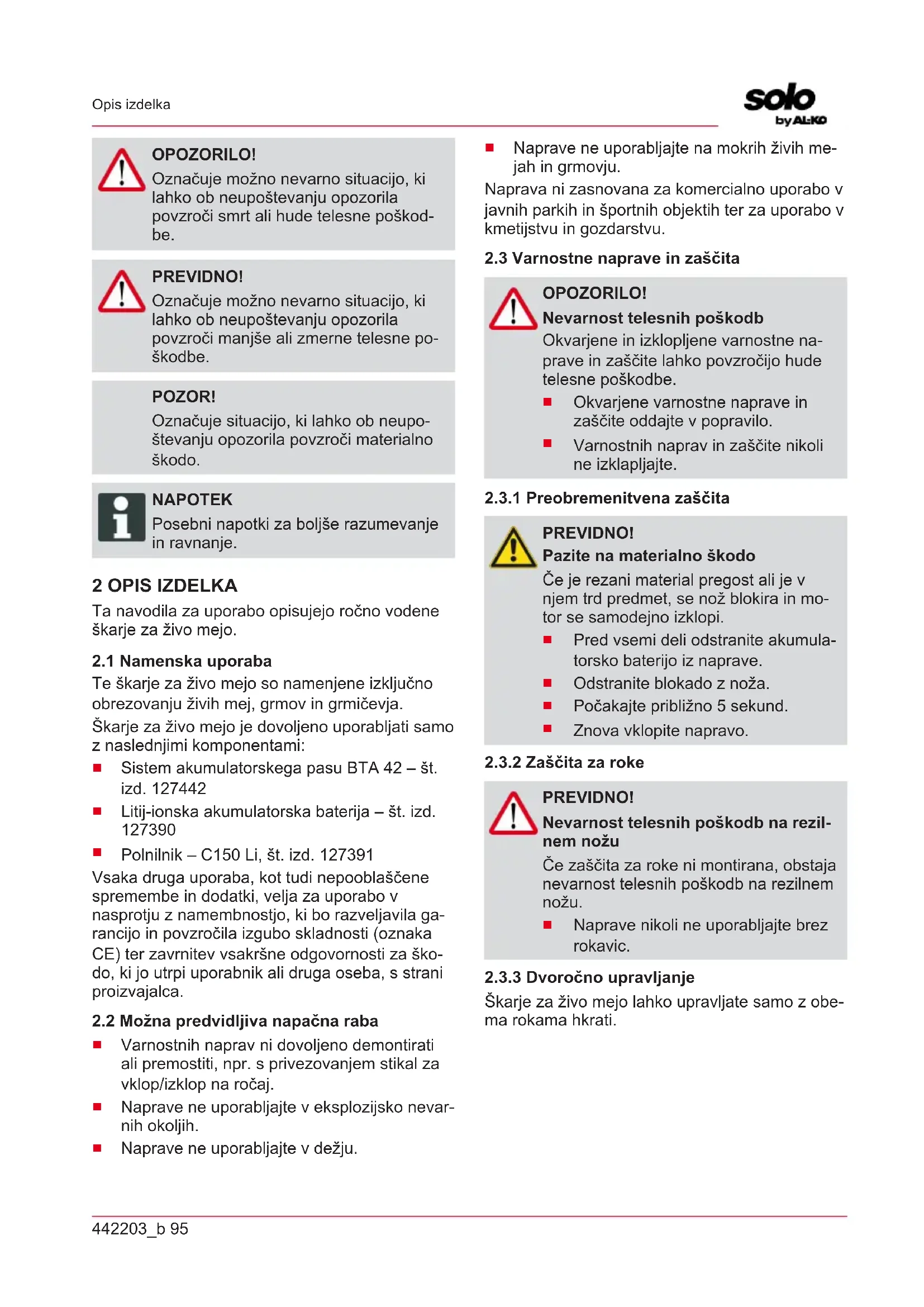 NEVARNOST! Označuje neposredno nevarno situacijo, ki bo ob neupoštevanju opozorila povzročila smrt ali hude telesne poškod- be.442203_b 95 Opis izdelka OPOZORILO! Označuje možno nevarno situacijo, ki lahko ob neupoštevanju opozorila povzroči smrt ali hude telesne poškod- be. PREVIDNO! Označuje možno nevarno situacijo, ki lahko ob neupoštevanju opozorila povzroči manjše ali zmerne telesne po- škodbe. POZOR! Označuje situacijo, ki lahko ob neupo- števanju opozorila povzroči materialno škodo. NAPOTEK Posebni napotki za boljše razumevanje in ravnanje. 2 OPIS IZDELKA Ta navodila za uporabo opisujejo ročno vodene škarje za živo mejo.