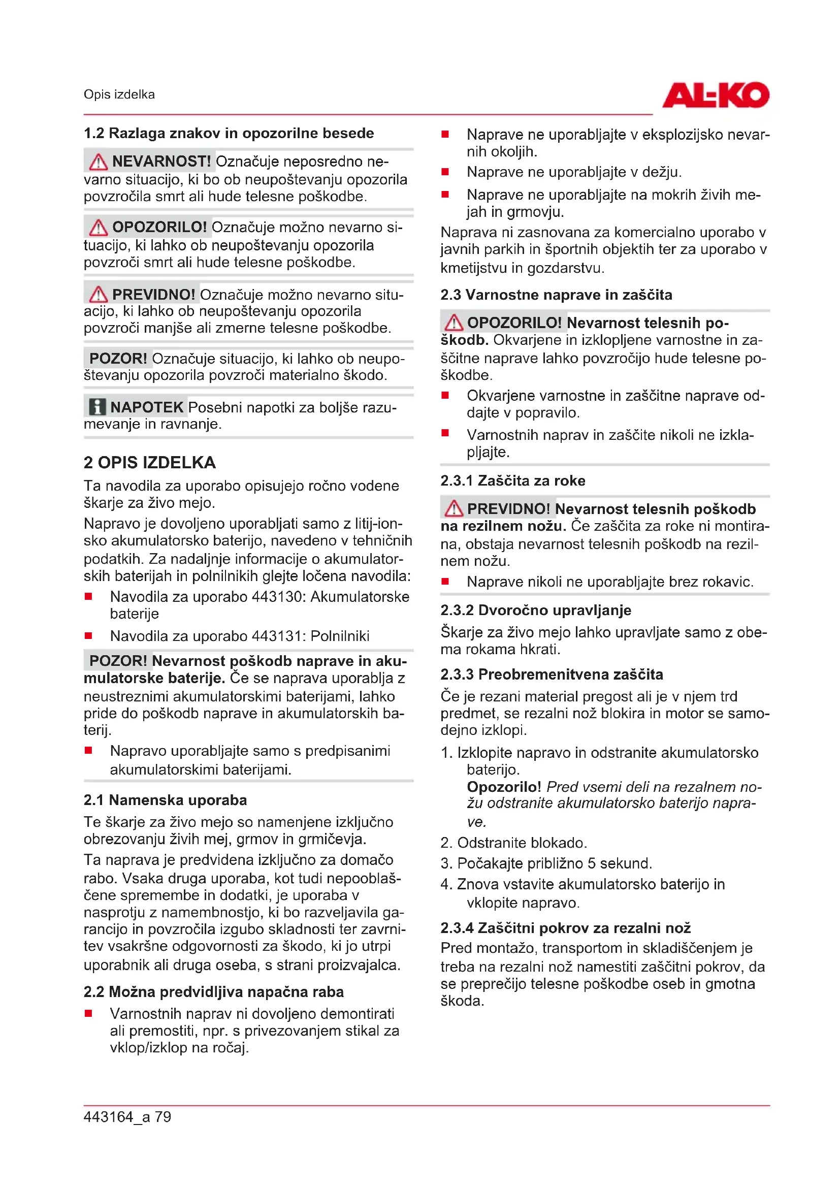 NEVARNOST! Označuje neposredno ne- varno situacijo, ki bo ob neupoštevanju opozorila povzročila smrt ali hude telesne poškodbe. OPOZORILO! Označuje možno nevarno si- tuacijo, ki lahko ob neupoštevanju opozorila povzroči smrt ali hude telesne poškodbe. PREVIDNO! Označuje možno nevarno situ- acijo, ki lahko ob neupoštevanju opozorila povzroči manjše ali zmerne telesne poškodbe. POZOR! Označuje situacijo, ki lahko ob neupo- števanju opozorila povzroči materialno škodo. NAPOTEK Posebni napotki za boljše razu- mevanje in ravnanje. 2 OPIS IZDELKA Ta navodila za uporabo opisujejo ročno vodene škarje za živo mejo. Napravo je dovoljeno uporabljati samo z litij-ion- sko akumulatorsko baterijo, navedeno v tehničnih podatkih. Za nadaljnje informacije o akumulator- skih baterijah in polnilnikih glejte ločena navodila: