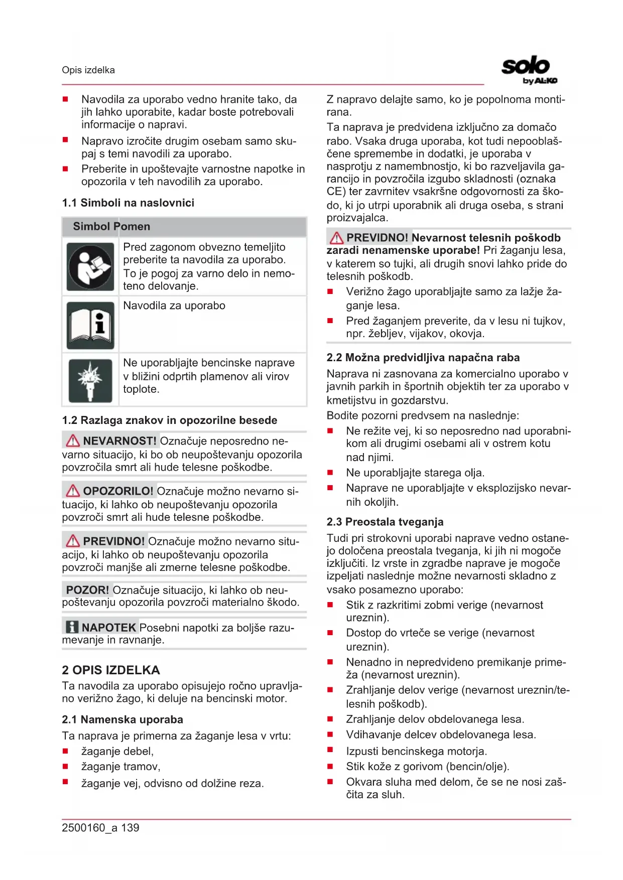 NEVARNOST! Označuje neposredno ne- varno situacijo, ki bo ob neupoštevanju opozorila povzročila smrt ali hude telesne poškodbe. OPOZORILO! Označuje možno nevarno si- tuacijo, ki lahko ob neupoštevanju opozorila povzroči smrt ali hude telesne poškodbe. PREVIDNO! Označuje možno nevarno situ- acijo, ki lahko ob neupoštevanju opozorila povzroči manjše ali zmerne telesne poškodbe. POZOR! Označuje situacijo, ki lahko ob neu- poštevanju opozorila povzroči materialno škodo. NAPOTEK Posebni napotki za boljše razu- mevanje in ravnanje. 2 OPIS IZDELKA Ta navodila za uporabo opisujejo ročno upravlja- no verižno žago, ki deluje na bencinski motor.