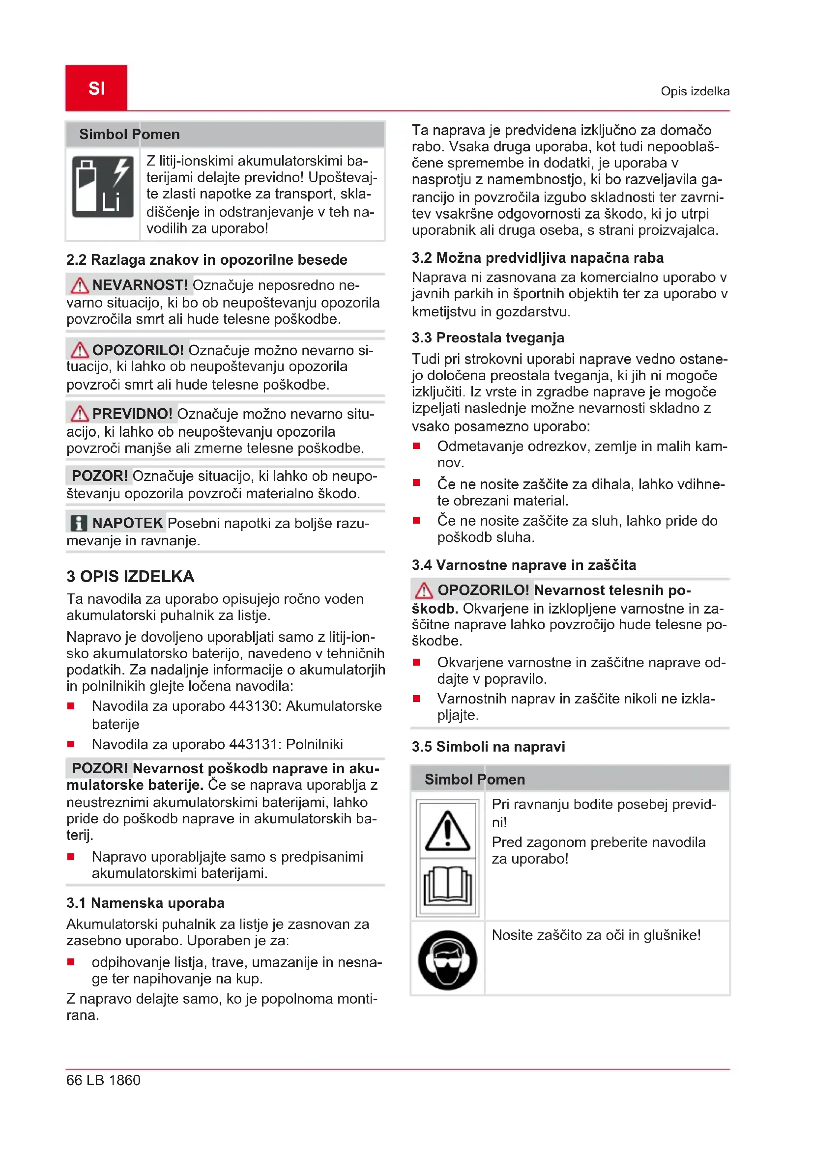 NEVARNOST! Označuje neposredno ne- varno situacijo, ki bo ob neupoštevanju opozorila povzročila smrt ali hude telesne poškodbe. OPOZORILO! Označuje možno nevarno si- tuacijo, ki lahko ob neupoštevanju opozorila povzroči smrt ali hude telesne poškodbe. PREVIDNO! Označuje možno nevarno situ- acijo, ki lahko ob neupoštevanju opozorila povzroči manjše ali zmerne telesne poškodbe. POZOR! Označuje situacijo, ki lahko ob neupo- števanju opozorila povzroči materialno škodo. NAPOTEK Posebni napotki za boljše razu- mevanje in ravnanje. 3 OPIS IZDELKA Ta navodila za uporabo opisujejo ročno voden akumulatorski puhalnik za listje. Napravo je dovoljeno uporabljati samo z litij-ion- sko akumulatorsko baterijo, navedeno v tehničnih podatkih. Za nadaljnje informacije o akumulatorjih in polnilnikih glejte ločena navodila: