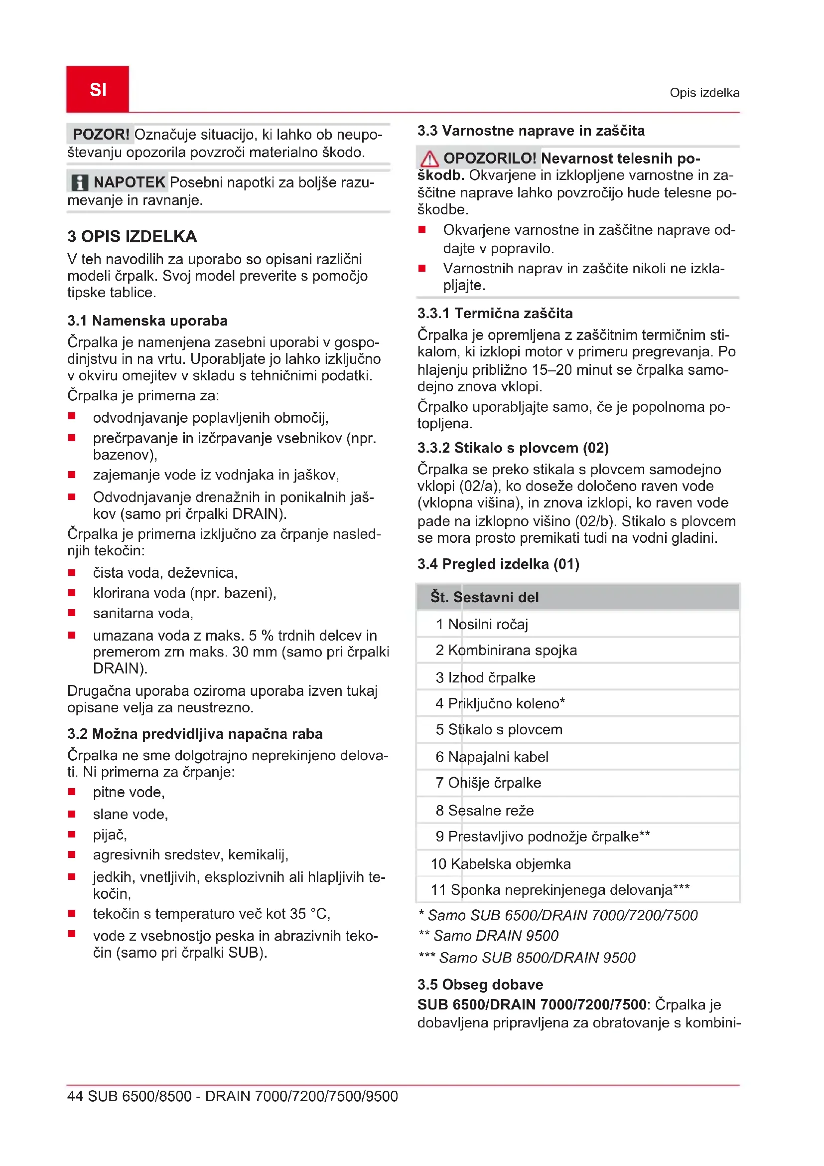Opis izdelka POZOR! Označuje situacijo, ki lahko ob neupo- števanju opozorila povzroči materialno škodo. NAPOTEK Posebni napotki za boljše razu- mevanje in ravnanje. 3 OPIS IZDELKA V teh navodilih za uporabo so opisani različni modeli črpalk. Svoj model preverite s pomočjo tipske tablice.