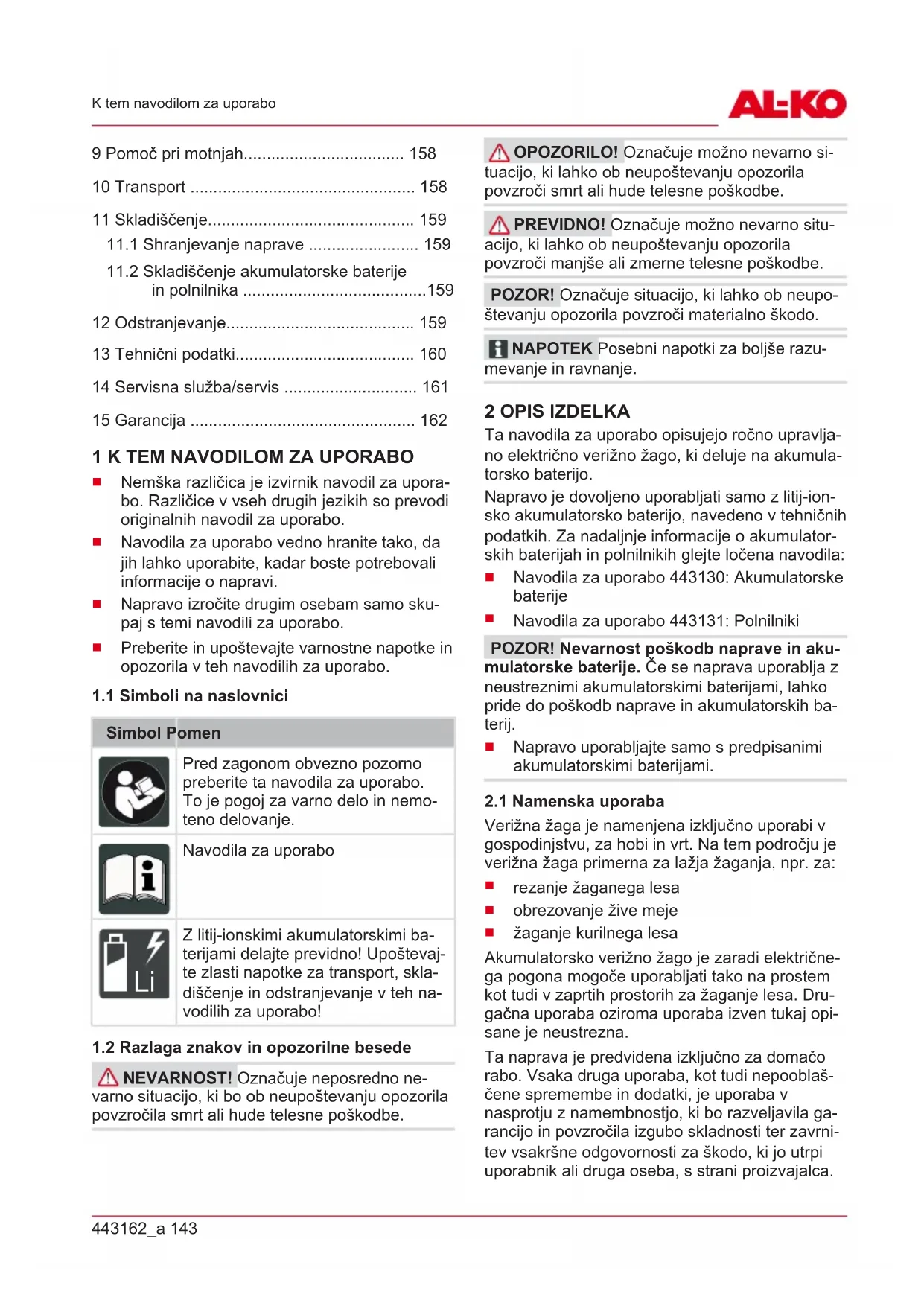 NEVARNOST! Označuje neposredno ne- varno situacijo, ki bo ob neupoštevanju opozorila povzročila smrt ali hude telesne poškodbe. OPOZORILO! Označuje možno nevarno si- tuacijo, ki lahko ob neupoštevanju opozorila povzroči smrt ali hude telesne poškodbe. PREVIDNO! Označuje možno nevarno situ- acijo, ki lahko ob neupoštevanju opozorila povzroči manjše ali zmerne telesne poškodbe. POZOR! Označuje situacijo, ki lahko ob neupo- števanju opozorila povzroči materialno škodo. NAPOTEK Posebni napotki za boljše razu- mevanje in ravnanje. 2 OPIS IZDELKA Ta navodila za uporabo opisujejo ročno upravlja- no električno verižno žago, ki deluje na akumula- torsko baterijo. Napravo je dovoljeno uporabljati samo z litij-ion- sko akumulatorsko baterijo, navedeno v tehničnih podatkih. Za nadaljnje informacije o akumulator- skih baterijah in polnilnikih glejte ločena navodila: