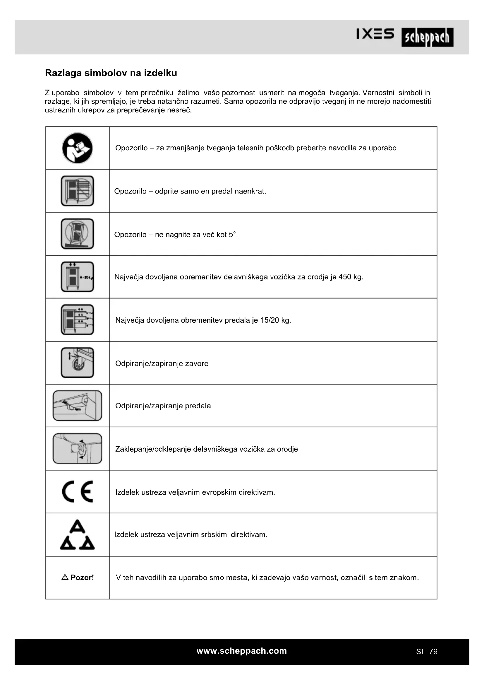 Razlaga simbolov na izdelku Z uporabo simbolov v tem priročniku želimo vašo pozornost usmeriti na mogoča tveganja. Varnostni simboli in razlage, ki jih spremljajo, je treba natančno razumeti. Sama opozorila ne odpravijo tveganj in ne morejo nadomestiti ustreznih ukrepov za preprečevanje nesreč. Opozorilo – za zmanjšanje tveganja telesnih poškodb preberite navodila za uporabo. Opozorilo – odprite samo en predal naenkrat. Opozorilo – ne nagnite za več kot 5°. 450kg Največja dovoljena obremenitev delavniškega vozička za orodje je 450 kg. 15kg 20kg 20kg Največja dovoljena obremenitev predala je 15/20 kg. Odpiranje/zapiranje zavore Odpiranje/zapiranje predala Zaklepanje/odklepanje delavniškega vozička za orodje Izdelek ustreza veljavnim evropskim direktivam. Izdelek ustreza veljavnim srbskimi direktivam. m Pozor! V teh navodilih za uporabo smo mesta, ki zadevajo vašo varnost, označili s tem znakom.www.scheppach.com