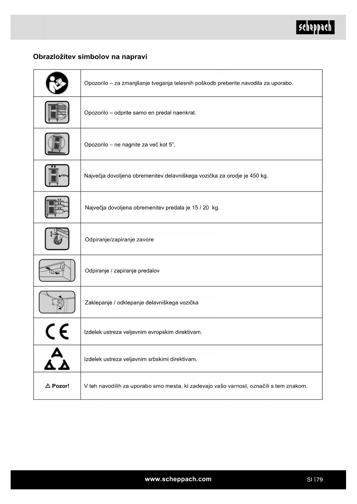 Obrazložitev simbolov na napravi Opozorilo – za zmanjšanje tveganja telesnih poškodb preberite navodila za uporabo. Opozorilo – odprite samo en predal naenkrat. Opozorilo – ne nagnite za več kot 5°. 450kg Največja dovoljena obremenitev delavniškega vozička za orodje je 450 kg. 15kg 20kg 20kg Največja dovoljena obremenitev predala je 15 / 20 kg. Odpiranje/zapiranje zavore Odpiranje / zapiranje predalov Zaklepanje / odklepanje delavniškega vozička Izdelek ustreza veljavnim evropskim direktivam. Izdelek ustreza veljavnim srbskimi direktivam. m Pozor! V teh navodilih za uporabo smo mesta, ki zadevajo vašo varnost, označili s tem znakom.www.scheppach.com