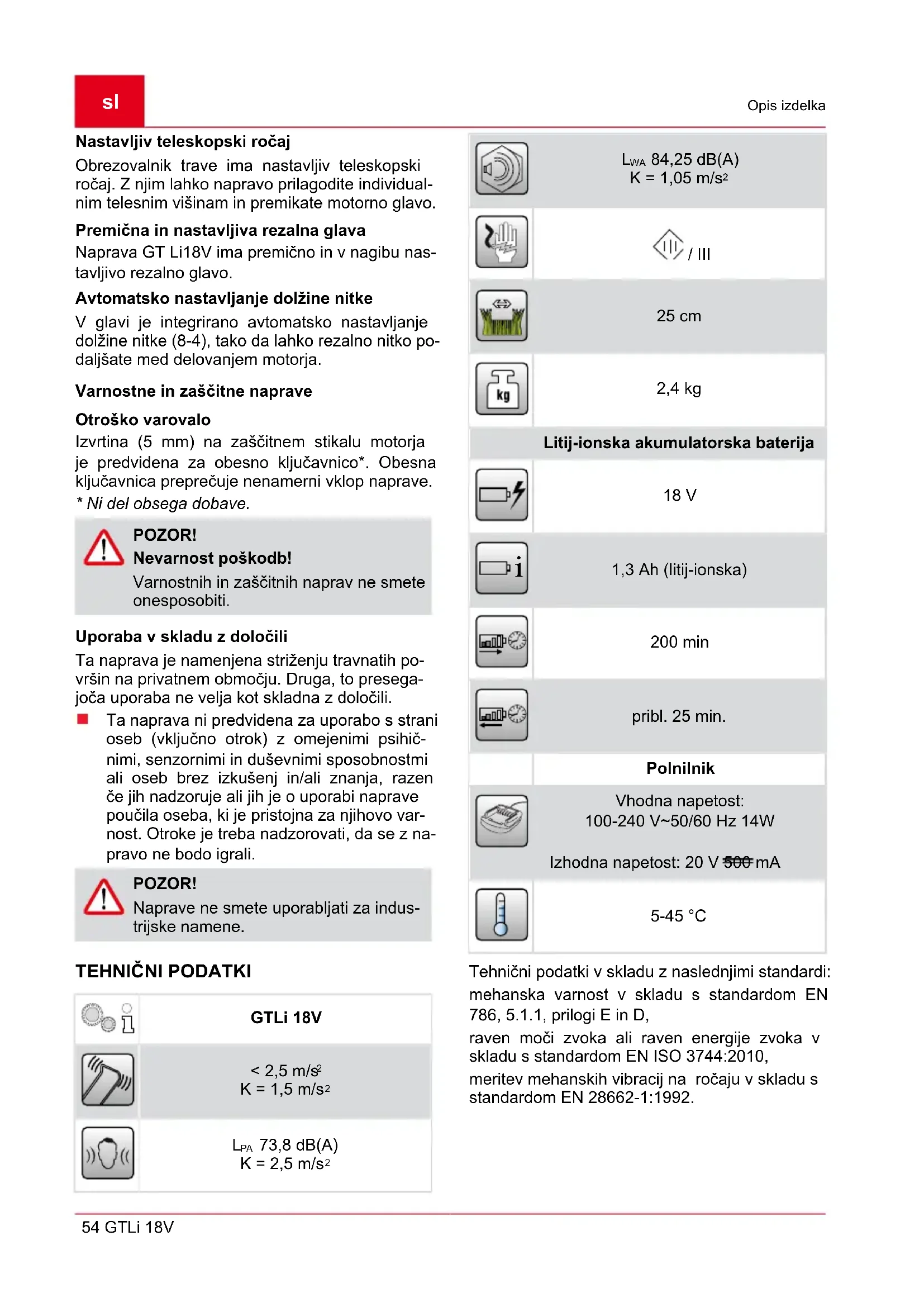 1,3 Ah (litij-ionska) 200 min pribl. 25 min. Polnilnik Vhodna napetost: 100-240 V~50/60 Hz 14W Izhodna napetost: 20 V 500 mA 5-45 °C Tehnični podatki v skladu z naslednjimi standardi: mehanska varnost v skladu s standardom EN 786, 5.1.1, prilogi E in D, raven moči zvoka ali raven energije zvoka v skladu s standardom EN ISO 3744:2010, meritev mehanskih vibracij na ročaju v skladu s standardom EN 28662-1:1992.Tehnični podatki 440084_c 55 ADVICE Navedene vrednosti so bile pridobljene s standardiziranim postopkom preiz- kušanja in jih je dovoljeno uporabiti za primerjanje različnih električnih orodij. Hkrati so te vrednosti primerne za predhodno ocenjevanje obremenitev, ki za uporabnika nastanejo zaradi vibracij. OPOZORILO! Glede na uporabo električnega orodja lahko dejanske vrednosti vibracij odsto- pajo od navedenih vrednosti vibracij. Sprejmite ukrepe za zaščito pred obre- menitvami zaradi vibracij. Pri tem upoš- tevajte celoten potek dela, torej tudi tre- nutke, ko električno orodje dela brez ob- remenitve ali je izklopljeno. Primerni ukrepi med drugim vključujejo tudi redno vzdrževanje in nego električ- nega orodja in nastavkov orodja, ohran- janje toplih rok, redne premore in dobro načrtovanje poteka dela. VARNOSTNA OPOZORILA POZOR! Rezalno orodje se po izklopu motorja še vrti. Delajte vedno v ustreznih oblačilih, nosite zaščito za oči in rokavice OPOZORILO! Nosite zaščito za sluh, da preprečite poš- kodbe sluha. Nikoli ne dovolite, da bi stroj uporabljali ali vzdrževali otroci ali osebe, ki niso ustrezno usposobljene. Lokalni predpisi lahko določajo minimalno starost upravljavcev Prekinite uporabo naprave, če so v bližini osebe, predvsem otroci ali hišni ljubljenčki. Kosite lahko samo pri dnevni svetlobi ali pri dobri umetni razsvetljavi. Pred začetkom uporabe stroja in po kakrš- nemkoli udarcu preglejte stroj glede znakov obrabe ali poškodb ter zagotovite potrebna popravila. Naprave nikoli ne uporabljajte s poškodov- animi ali odstranjenimi zaščitami. Rok in stopal nikoli ne približujte rezilu, predvsem pri vklopu motorja. Nevarnost poškodb obstaja na vsaki napravi, ki se uporablja za rezanje nitke. Po izvlečenju nove nitke stroj pred vklopom vedno držite v njegovem normalnem delov- nem položaju. Nikoli ne montirajte kovinskih rezalnih ele- mentov. Uporabljajte samo originalne nadomestne dele. Vedno odstranite akumulatorsko baterijo, ko naprava ni pod nadzorom, pred vzdrževalnimi deli, pred čiščenjem naprave, če naprave dlje časa ne boste upor- abljali. Bodite pozorni, da odprtine za zrak ne bodo umazane. Kljub tehničnim in dodatnim varnostnim ukre- pom pri delu s strojem vedno obstaja do- ločeno preostalo tveganje. Držala morajo biti suha in čista. Iz delovnega območja odstranite tujke. Izdelek uporabljajte le v tehnično brezhibne stanju Ščitniki, glava z nitjo in motor naj bodo vedno očiščeni ostankov košnje. Telo in obleko držite stran od rezil. Osebe, ki ne poznajo striženja, naj postopek vadijo pri ugasnjenem motorju. Nosite delovna oblačila, ki bodo primerna za namen uporabe. Pri delu poskrbite za stabilen položaj. Napravo vodite vedno z obema rokama. Tretjim ne dovolite v območje nevarnosti. Naprave nikoli ne pustite brez nadzora. Pri košnji na strmih pobočjih vedno stojte pod rezalno napravo. Pri delih na strminah: Nikoli ne delujejo na gladko in spolzko pobočje. Vedno pazite na varno stojo. Vedno kosite prečno ob strmini, nikoli navzgor ali navzdol. Ne kosite na strminah z vzponom večjim od 20°! Bodite posebej previdni pri obračanju!sl Varnostna opozorila 56 GTLi 18V Po stiku s tujkom: Izključite motor. Preverite, če je naprava poškodovana. Naprave ne uporabljajte, kadar ste pod vpli- vom alkohola, drog ali zdravil. Upoštevati je treba predpise za prepreče- vanje nesreč. Naprave ne izpostavljajte mokroti ali vlagi. Otroci se ne smejo približati napravam z aku- mulatorsko baterijo. Električna varnost PREVIDNO! Nevarnost pri dotikanju delov pod na- petostjo! Vtič takoj odklopite iz omrežja, če je podaljšek poškodovan ali pretrgan! Pri- poročamo priključitev preko zaščitnega FI-stikala z nazivnim okvarnim tokom < 30 mA. Hišna omrežna napetost se mora skladati s podatki o omrežni napetosti v tehničnih podatkih, ne uporabljajte drugačnega napa- janja. Uporabljajte izključno podaljševalne kable, ki so predvideni za uporabo na prostem – z minimalnim prerezom 1,5 mm